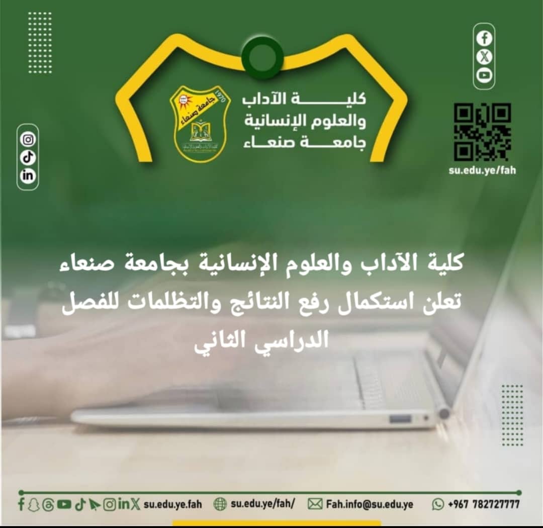 أعلنت كلية الآداب والعلوم الإنسانية بجامعة صنعاء استكمال جميع الإجراءات المتعلقة برفع نتائج الفصل الدراسي الثاني للعام الجامعي 2025–2026م لكافة المستويات، وذلك عبر بوابة خدمات الطالب الإلكترونية. وأوضحت الكلية أنه قد تم كذلك استكمال استقبال ومعالجة التظلمات الخاصة بنتائج أعمال …