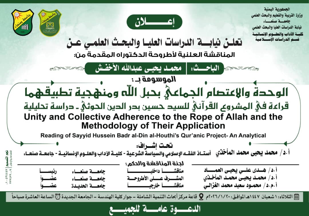 صنعاء أعلنت نيابة الدراسات العليا والبحث العلمي بجامعة صنعاء عن موعد المناقشة العلنية لأطروحة الدكتوراه المقدمة من الباحث محمد يحيى عبدالله الأخفش بقسم الدراسات الإسلامية في كلية الآداب والعلوم الإنسانية ،وتحمل الأطروحة عنوان: (الوحدة والاعتصام الجماعي بحبل الله ومنهجية تطبيقهما …