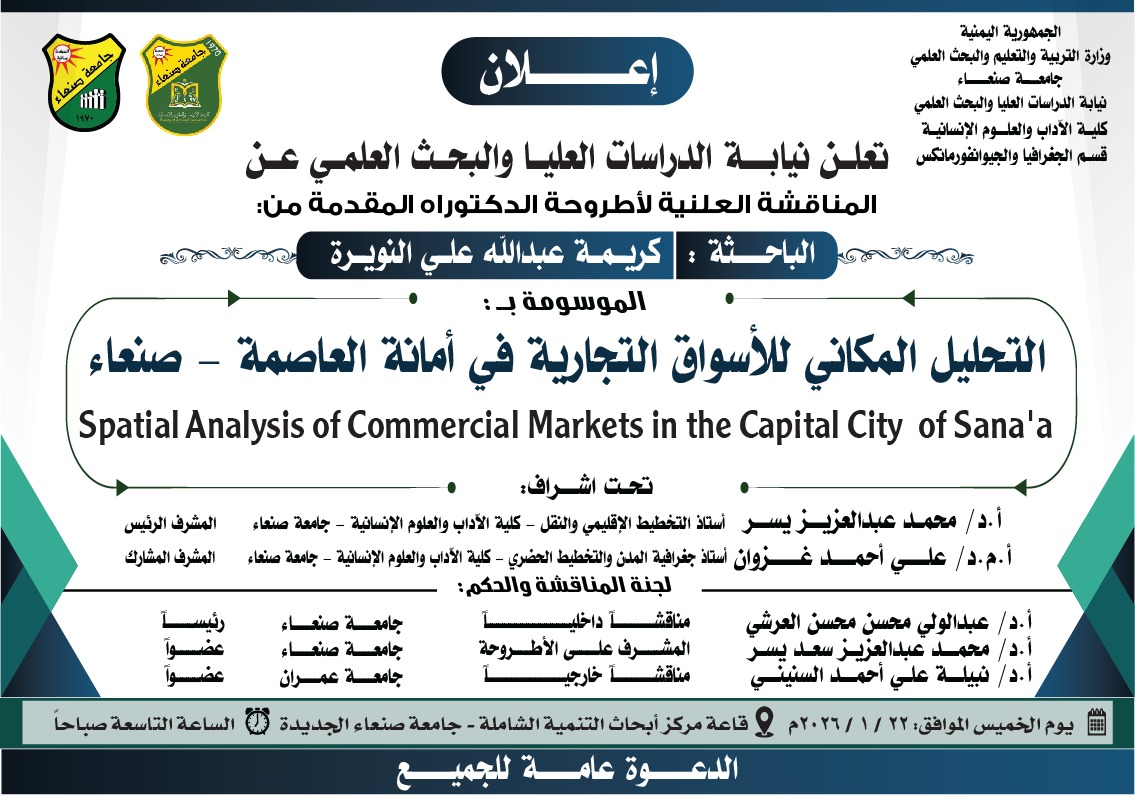 أعلنت نيابة الدراسات العليا والبحث العلمي بجامعة صنعاء عن موعد المناقشة العلنية لأطروحة الدكتوراه المقدمة من الباحثة كريمة عبدالله علي النويرة بقسم الجغرافيا والجيوانفورماتكس في كلية الآداب والعلوم الإنسانية. وتحمل الأطروحة عنوان:التحليل المكاني للأسواق التجارية في أمانة العاصمة – صنعاء …