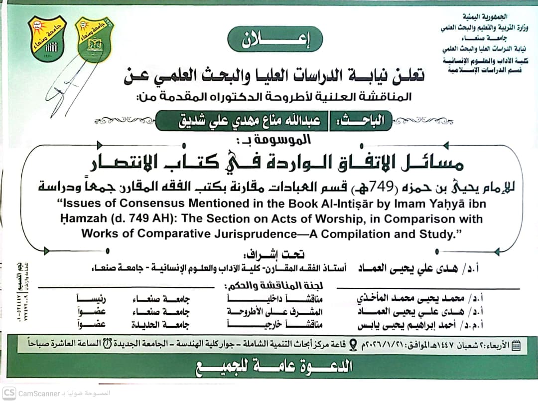 تعلن نيابة الدراسات العليا والبحث العلمي بجامعة صنعاء عن عقد المناقشة العلنية لأطروحة الدكتوراه المقدمة من الباحث عبدالله مناع مهدي علي شديق من قسم الدراسات الإسلامية بكلية الآداب والعلوم الإنسانية. وتحمل الأطروحة عنوان:(مسائل الاتفاق الواردة في كتاب الانتصار للإمام يحيى …