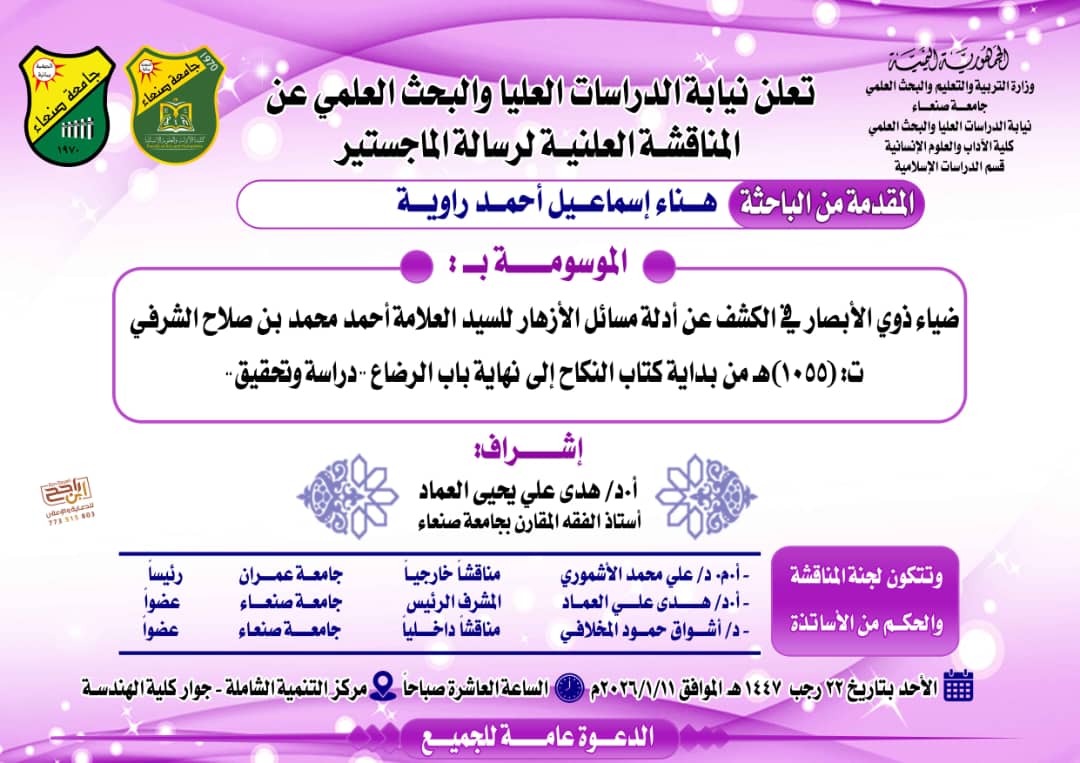 تُعلن نيابة الدراسات العليا والبحث العلمي بجامعة صنعاء عن إقامة المناقشة العلنية لرسالة الماجستير المقدمة من الباحثة هناء إسماعيل أحمد راوية، بقسم الدراسات الإسلامية، كلية الآداب والعلوم الإنسانية – جامعة صنعاء ،التي تحمل عنوان:«ضياء ذوي الأبصار في الكشف عن أدلة …