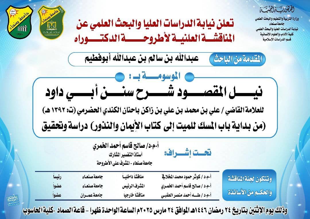 The Deanship of Graduate Studies and Scientific Research at Sana’a University announces the public discussion of the doctoral dissertation submitted by researcher Abdullah bin Salem bin Abdullah Abu Futaim, Department of Islamic Studies, Faculty of Arts and Humanities, on his dissertation entitled “Nayl al-Maqsud: A Commentary on Sunan Abi Dawood by Scholar Judge Ali bin Muhammad bin Ali bin Zaken Bahannan al-Kindi al-Hadrami (d. 1392 AH) from the beginning of the chapter on musk for the deceased to the chapter of oaths and vows”; a study and investigation.