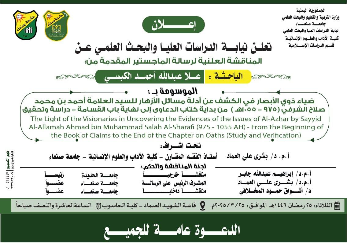 The Deanship of the Post-Graduate Studies and Scientific Research hereby announces the public defense of the MA thesis submitted by Ms. Ola Abdullah Ahmed Al-Kabsi, from the Department of Islamic Studies, Faculty of Arts & Humanities – Sana’a University, titled: “The Light of the Visionaries in Uncovering the Evidences of the Issues of Al-Azhar by Sayyid Al-Allamah Ahmad bin Muhammad Salah Al-Sharafi (975 – 1055 AH) – From the Beginning of the Chapter of Claims to the End of the Chapter on Oaths: Study and Verification.”