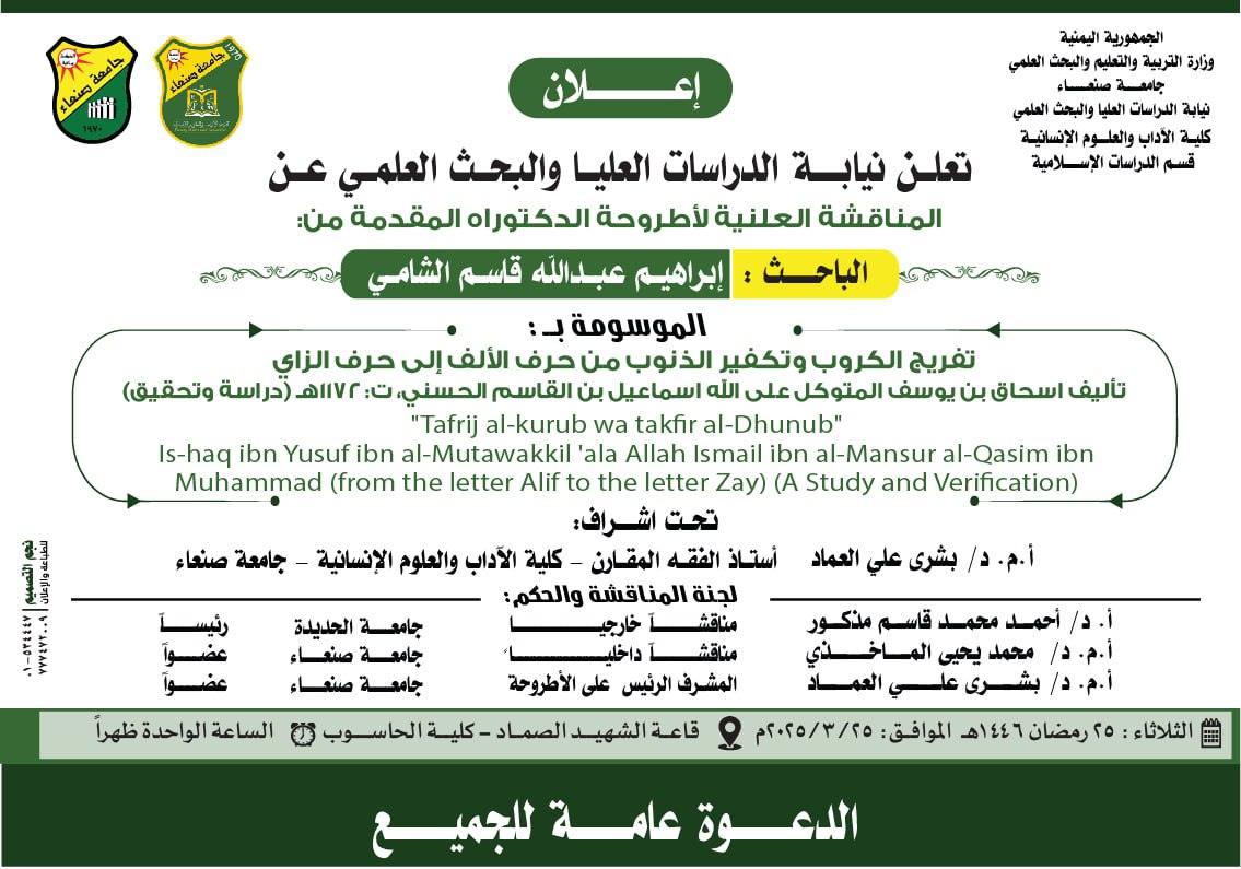 The Vice-Rector’s Office for Post-Graduate Studies and Scientific Research hereby announces the public defense of the PhD dissertation submitted by Mr. Ibrahim Abdullah Qasem Al-Shami, from the Department of Islamic Studies, Faculty of Arts & Humanities – Sana’a University, titled: “Tafrij al-kurub wa takfir al-Dhunub”