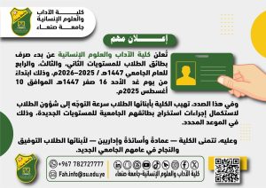 The Faculty of Arts and Humanities is pleased to announce that the distribution of student university cards for students in the second, third, and fourth levels for the academic year 1447 Hijri / 2025–2026 is set to begin.