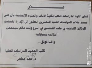 The Office of Graduate Studies at the Faculty of Arts & Humanities hereby informs all graduate students with incomplete documentation to promptly visit the office and submit the outstanding materials required for their coordination files. Timely compliance is essential; students who fail to meet this requirement shall assume full responsibility for any resulting delays or administrative consequences.