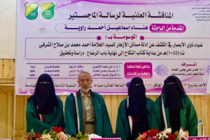 Ms. Hanaa Ismail Ahmed Rawiya was awarded a Master’s Degree in Islamic Comparative Jurisprudence with an average of Excellent (First-Class Honors) and a grade of (95) for her thesis titled: Diya Dhawi Al-Absar fi Al-Kashf Aan Adillat Masail Al-Azhar by Scholar Ahmed Mohammed Salah Al-Sharafi (d. 1055 AH) – From the Beginning of Marriage Chapter of to the End of Breastfeeding Chapter: A Critical Study and Investigation, which was submitted to the Department of Islamic Studies, Faculty of Arts and Humanities – Sana’a University. The MA defense was held on Sunday, January 11, 2026.