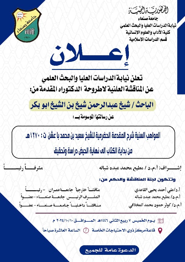 Public PhD Viva-Voce Examination of Mr. Sheikh Abdulrahman Sheikh bin Sheikh Abkar, from the Department of Islamic Studies, Faculty of Arts & Humanities – Sana’a University The Post-Graduate Studies and Scientific Research hereby announces the public defense of the PhD …