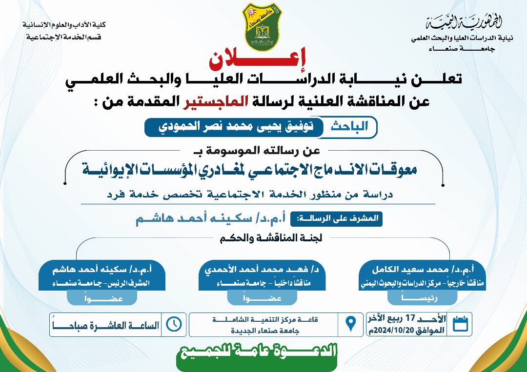 Public MA Viva-Voce Examination of Mr. Tawfiq Yahya Muhammad Nasr Al-Hamoudi, from the Department of Social Work, Faculty of Arts & Humanities – Sana’a University The Post-Graduate Studies and Scientific Research hereby announces the public defense of the MA thesis …