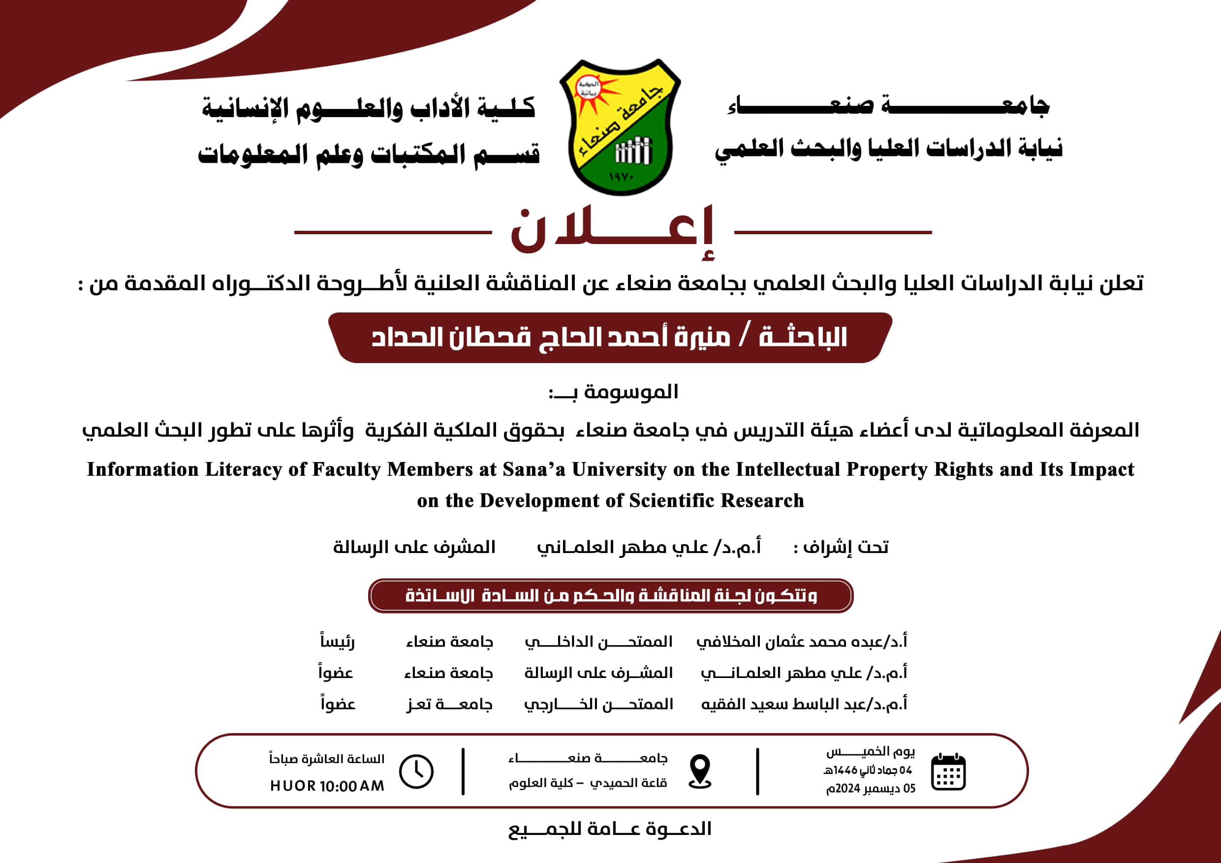 Public PhD Viva-Voce Examination of Ms. Munira Ahmed Al-Hajj Qahtan Al-Haddad, from the Department of Library and Information Sciences, Faculty of Arts & Humanities – Sana’a University The Post-Graduate Studies and Scientific Research hereby announces the public defense of the …