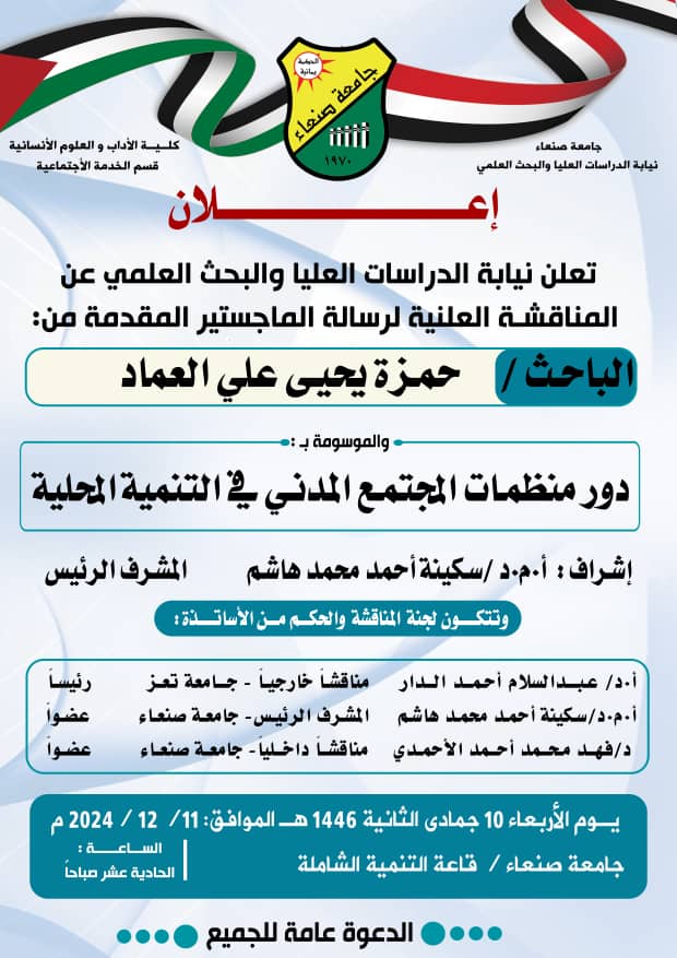 Public MA Viva-Voce Examination of Mr. Hamza Yahya Ali Al-Imad, from the Department of Social Work, Faculty of Arts & Humanities – Sana’a University The Post-Graduate Studies and Scientific Research hereby announces the public defense of the MA thesis submitted …