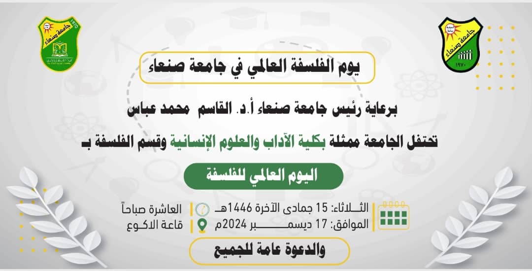 Under the auspices of Prof. Al-Qasim Mohammed Abbas, Rector of Sana’a University, the University, through its Faculty of Arts and Humanities and the Department of Philosophy, will commemorate “World Philosophy Day.” This event is scheduled for Tuesday, 15 Jumada 11 …