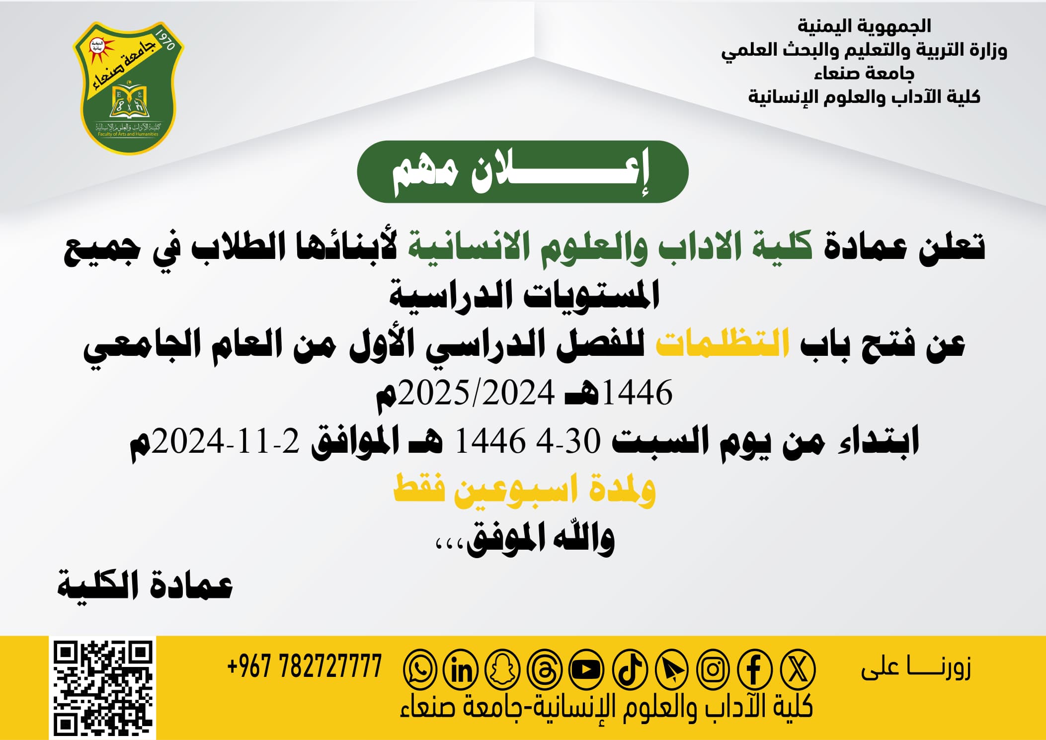 Important Announcement The Deanship of the Faculty of Arts & Humanities announces to all students at all academic levels that the Grievance Submission Period for the first semester of the academic year 1446 Hijri (2024/2025 ) will open on Saturday, …