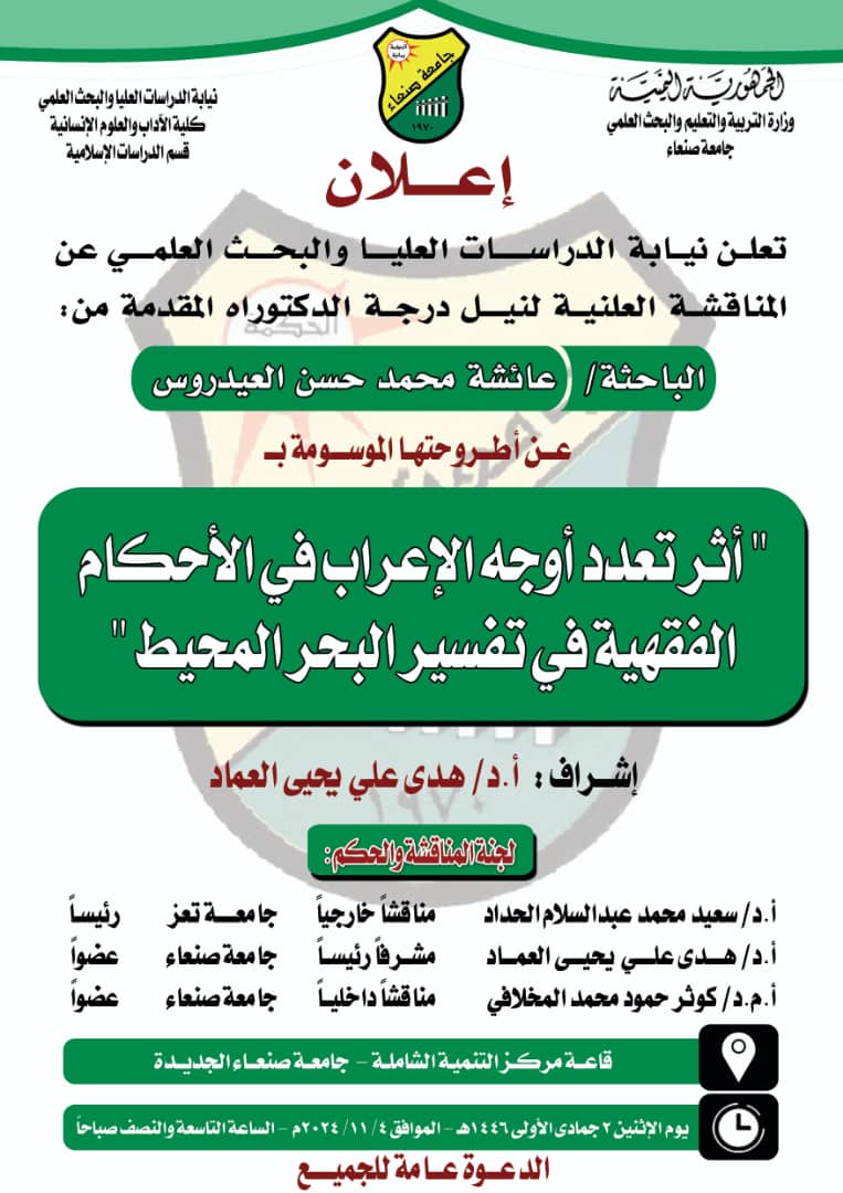 Public PhD Viva-Voce Examination of Ms. Aisha Mohammad Hassan Al-Eidaroos, from the Department of Islamic Studies, Faculty of Arts & Humanities – Sana’a University The Post-Graduate Studies and Scientific Research hereby announces the public defense of the PhD dissertation submitted …