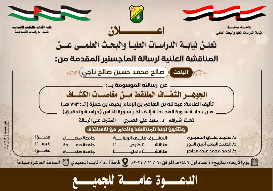 Public MA Viva-Voce Examination of Mr. Saleh Mohammad Hussein Saleh Naji, from the Department of Islamic Studies, Faculty of Arts & Humanities – Sana’a University The Post-Graduate Studies and Scientific Research hereby announces the public defense of the MA thesis …