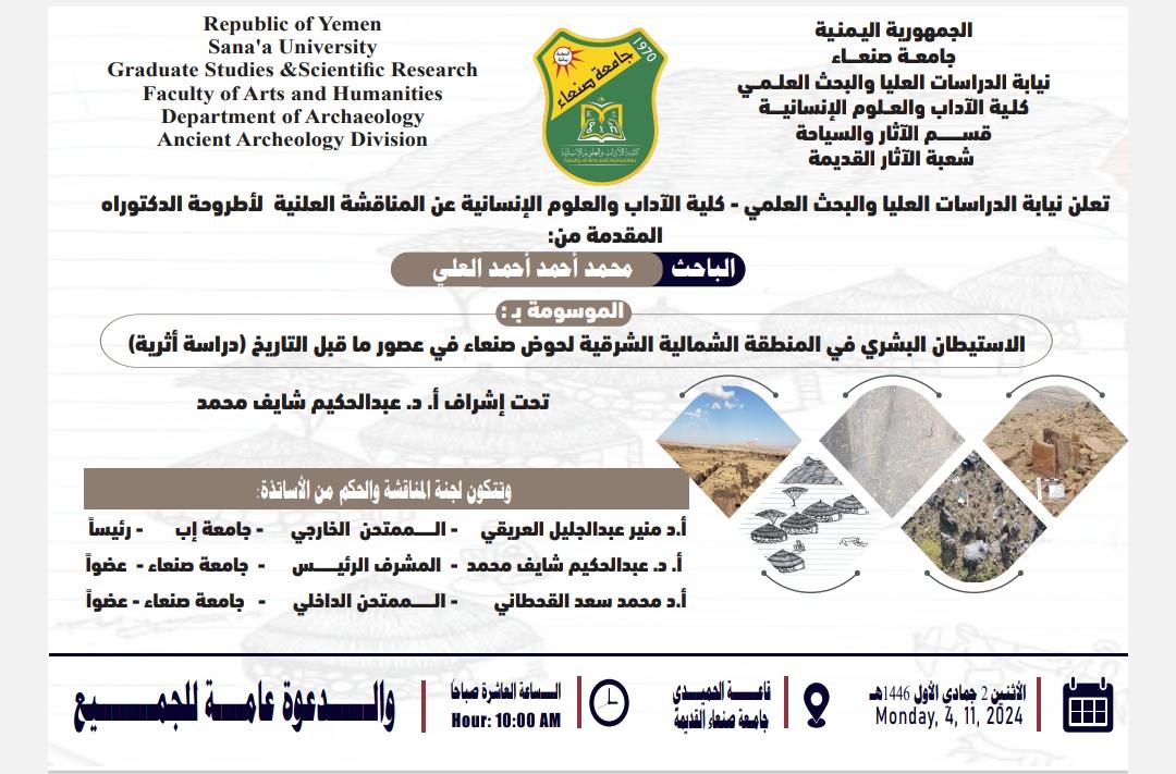Public PhD Viva-Voce Examination of Mr. Mohammad Ahmad Ahmad Al-Ali, from the Department of Archaeology, Faculty of Arts & Humanities – Sana’a University The Post-Graduate Studies and Scientific Research hereby announces the public defense of the PhD dissertation submitted by …