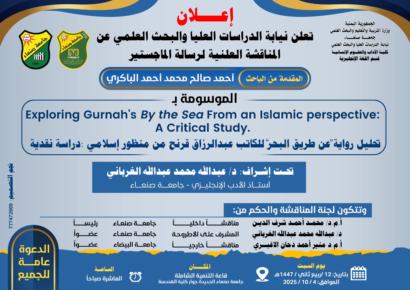 Mr. Ahmed Saleh Mohammed Ahmed Al-Bakeri was awarded a Master’s Degree in English Literature with an average of (Excellent) and a grade of (91%) for his thesis titled: Exploring Gurnah’s By the Sea from an Islamic Perspective: A Critical Study, …