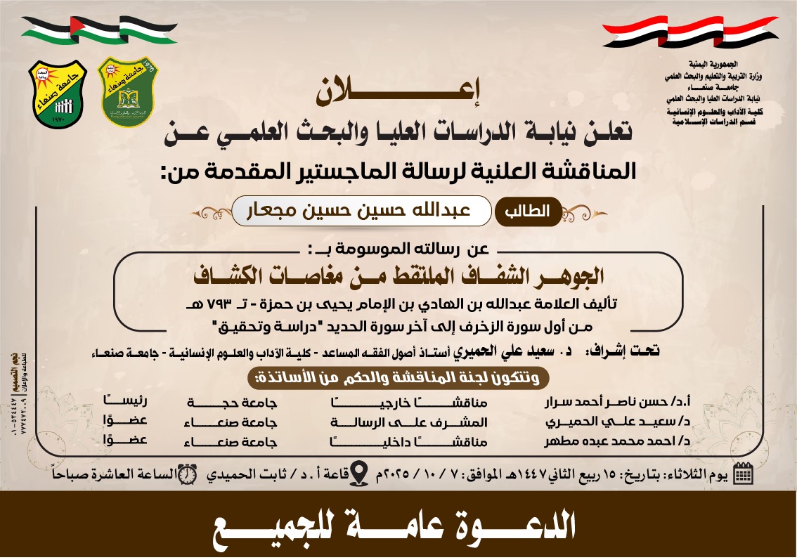 Vice Rector’s Office for Graduate Studies and Scientific Research cordially invites you to attend the public defense of the Master’s Thesis entitled: “Al-Jawhar Al-Shaffaf Al-Multaqat Min Maghasat Al-Kashshaf,” authored by Allama Abdullah bin Al-Hadi bin Al-Imam Yahya bin Hamza (d. …