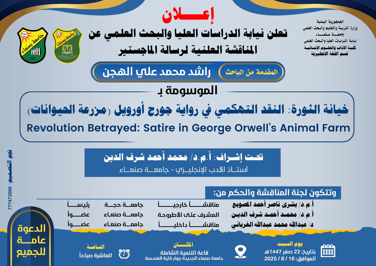 Vice Rector’s Office for Graduate Studies and Scientific Research cordially invites you to attend the public defense of the Master’s Thesis entitled: “Betrayal of Revolution: Satirical Criticism in George Orwell’s Novel (Animal Farm)” Candidate: Mr. Rashed Mohammed Ali Al-Hajen Department …