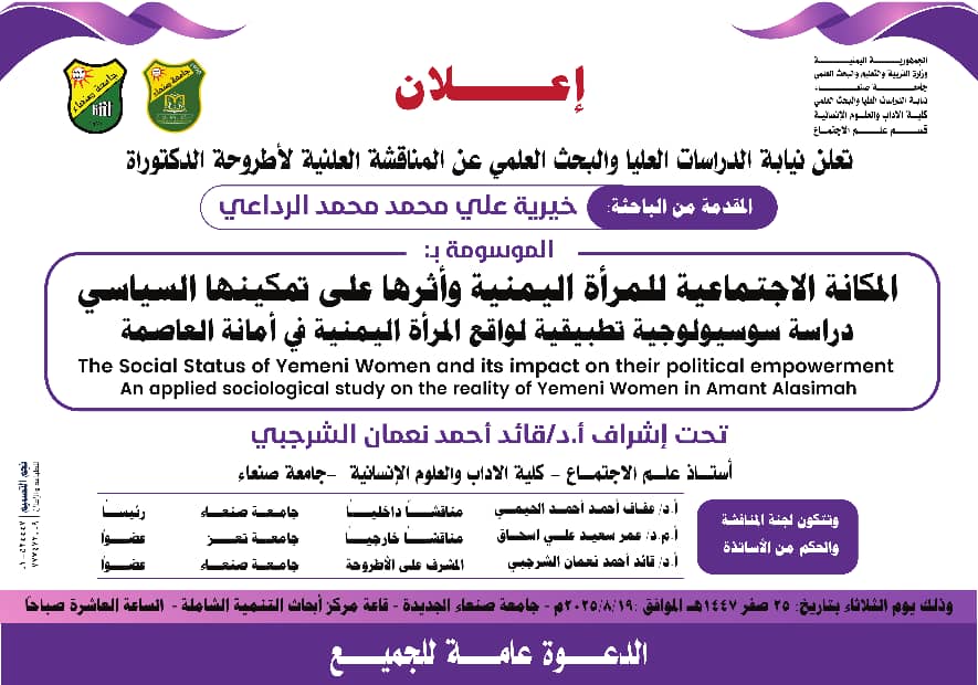 Vice Rector’s Office for Graduate Studies and Scientific Research cordially invites you to attend the public defense of the PhD Dissertation entitled: “Social Status of Yemeni Women and its Impact on their Political Empowerment: An Applied Sociological Study of the …