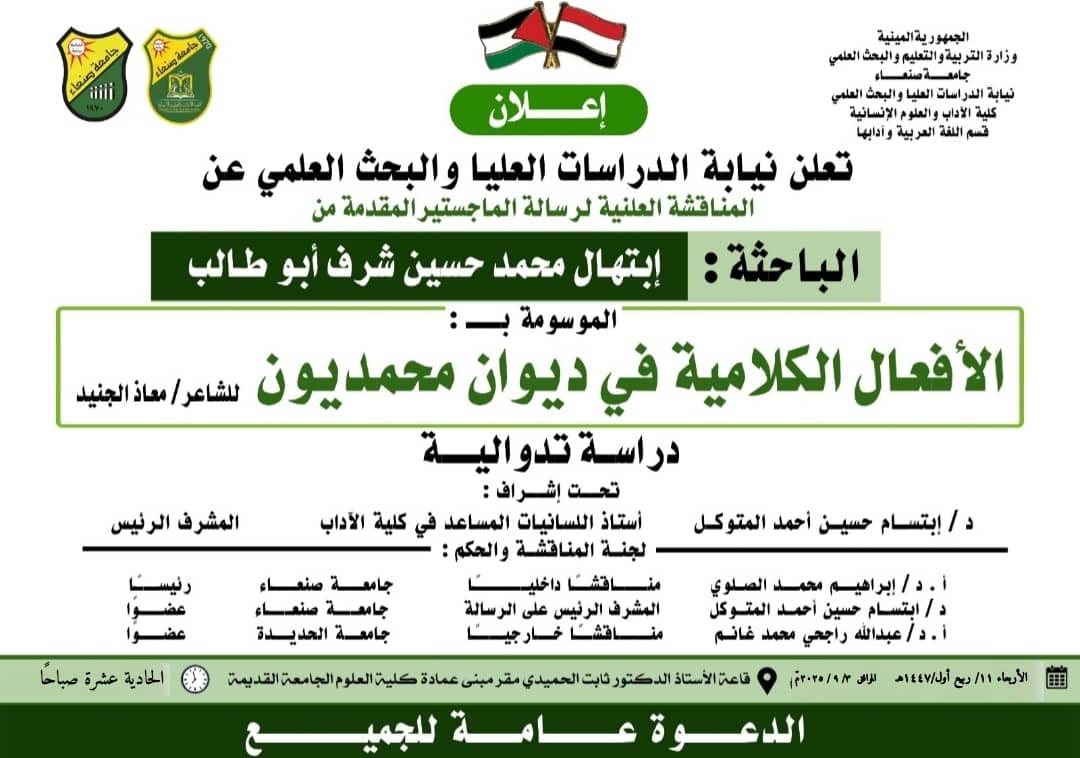 Vice Rector’s Office for Graduate Studies and Scientific Research cordially invites you to attend the public defense of the Master’s Thesis entitled: “Speech Acts in the Diwan ‘Mohammedans‘ by Poet Muath Al-Junaid: A Pragmatic Study” Details: Candidate: Ms. Ibtihal Mohammed …