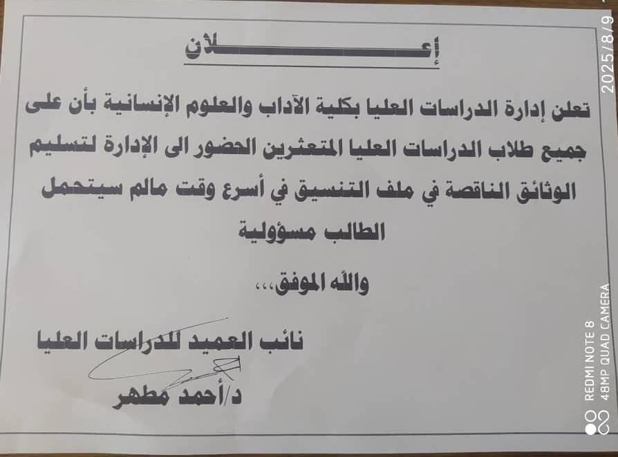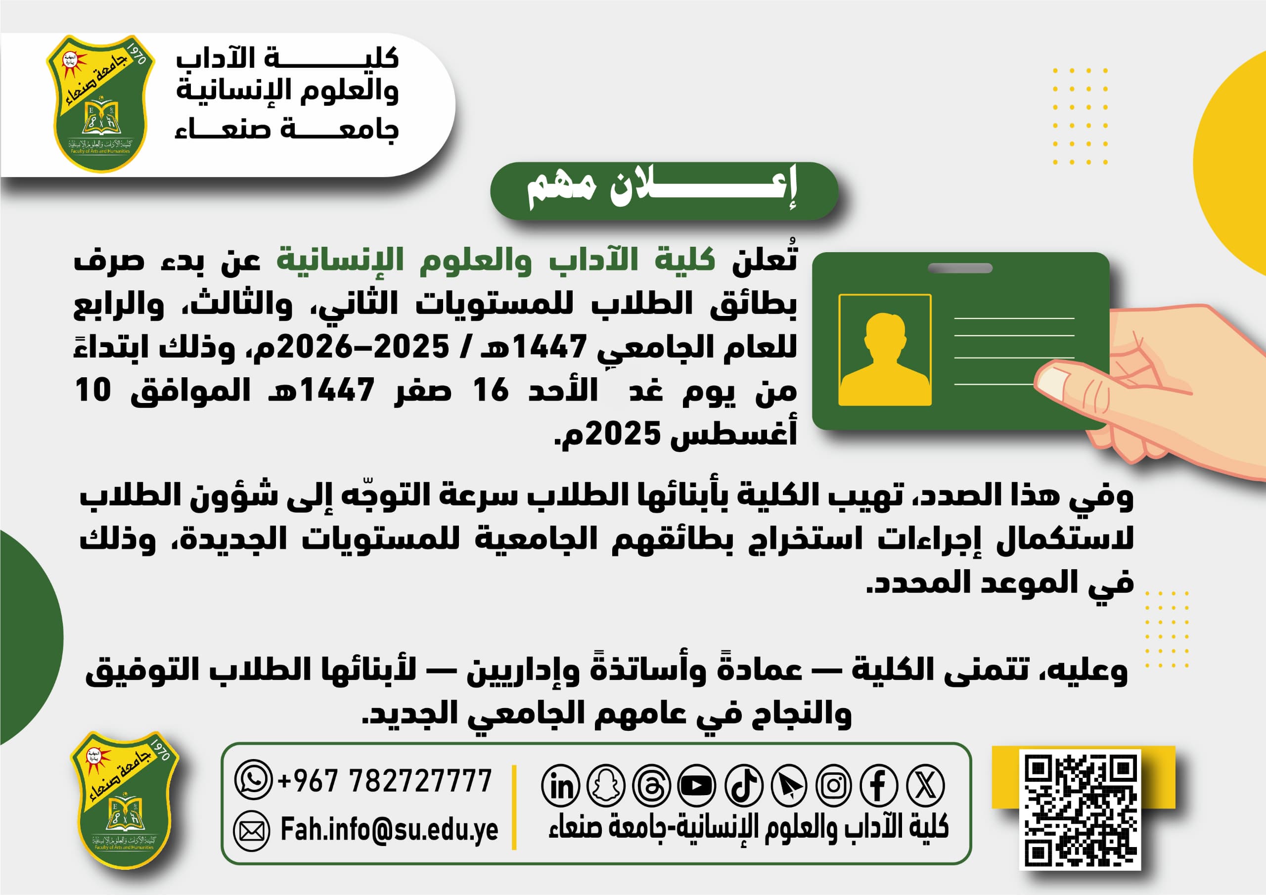 The Faculty of Arts and Humanities is pleased to announce that the distribution of student university cards for students in the second, third, and fourth levels for the academic year 1447 Hijri / 2025–2026 is set to begin. Distribution will …