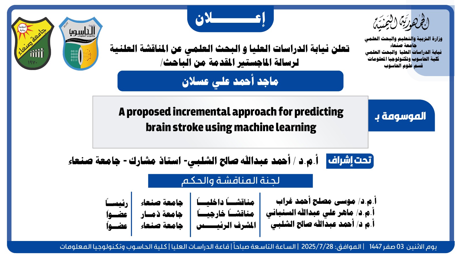 إعلان المناقشة العلنية لرسالة الماجستير المقدمة من الباحث ماجد أحمد علي عسلان
