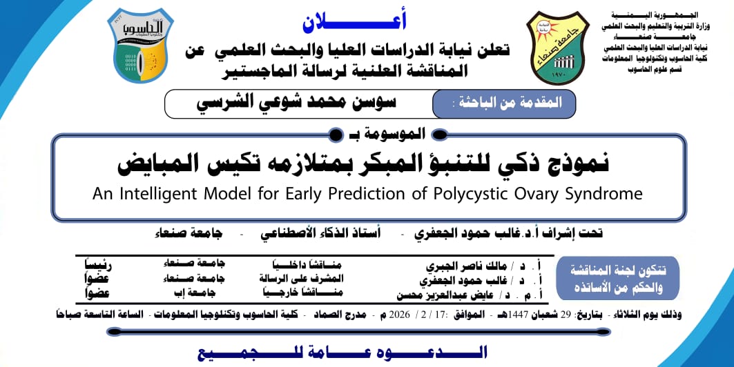 إعلان المناقشة العلنية لرسالة الماجستير المقدمة من الباحث عبدالرحمن حسين هاشم الحامس