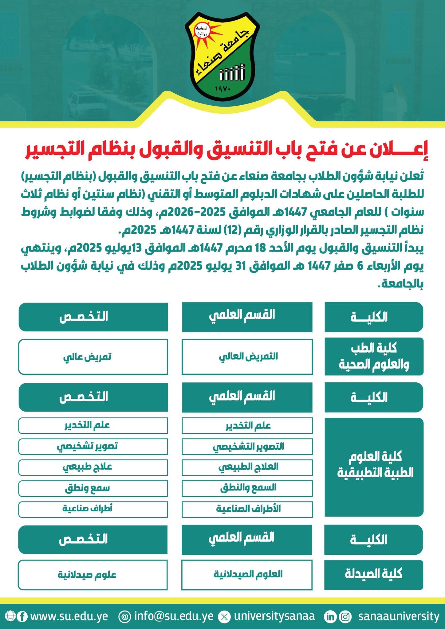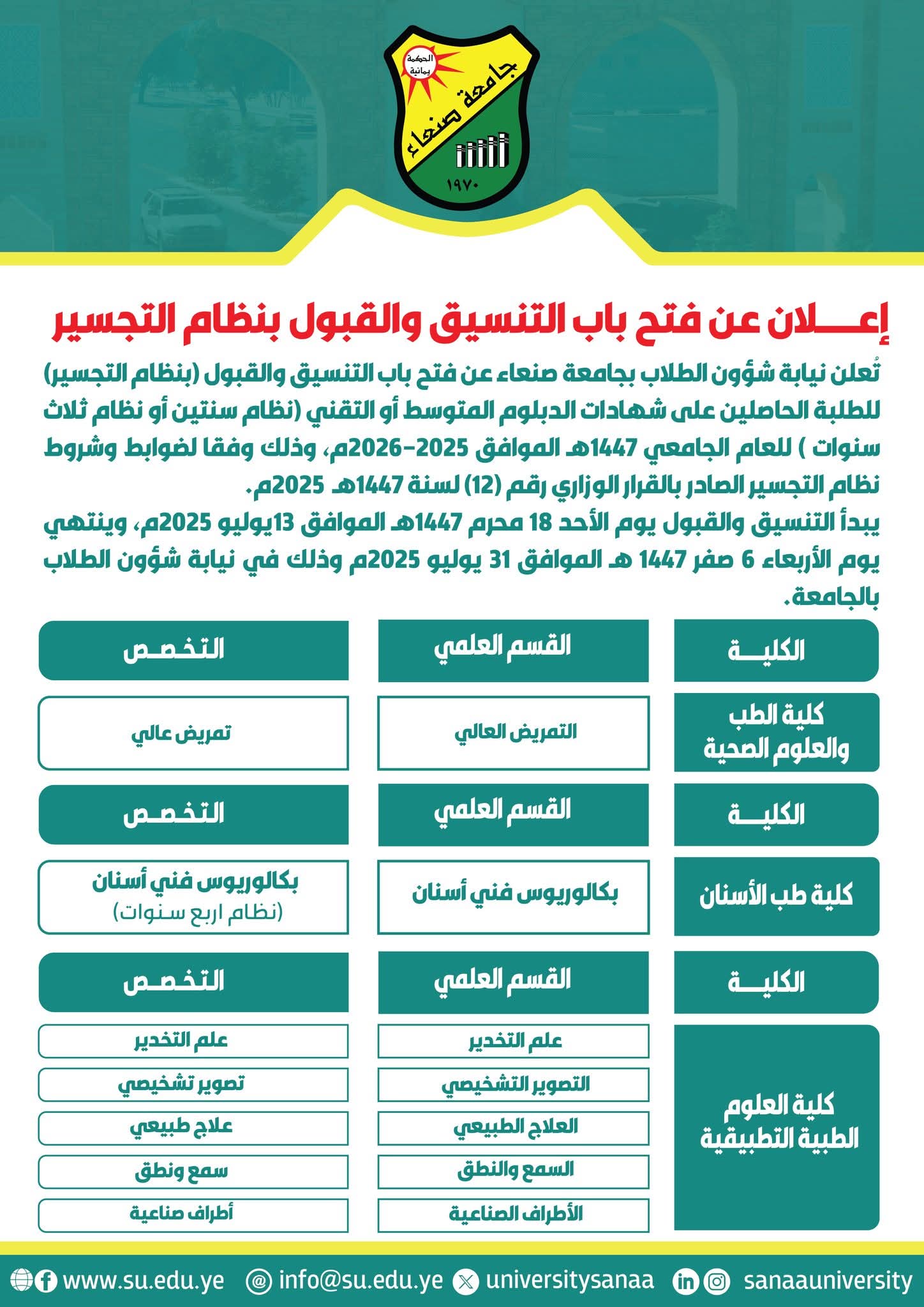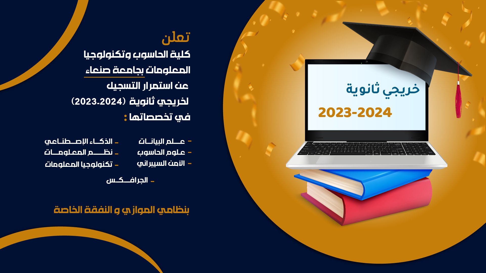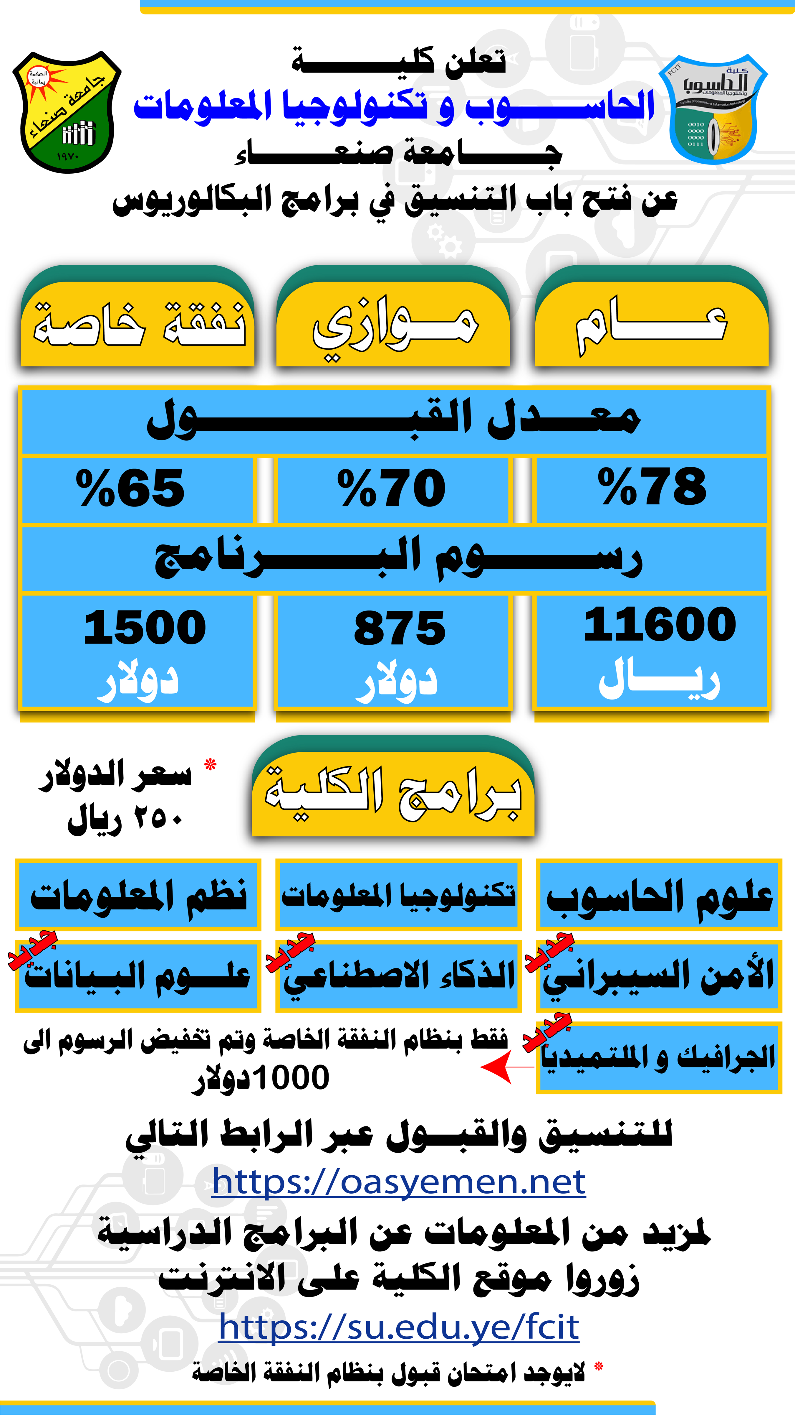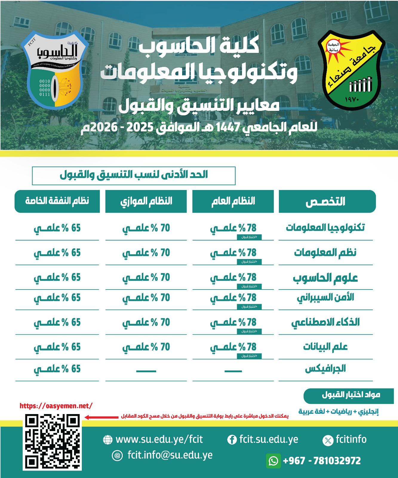 تعلن كلية الحاسوب وتكنولوجيا المعلومات بجامعة صنعاء عن فتح باب التنسيق (النظام الموازي ونظام النفقة الخاصة) للعام الجامعي 1447هـ : …