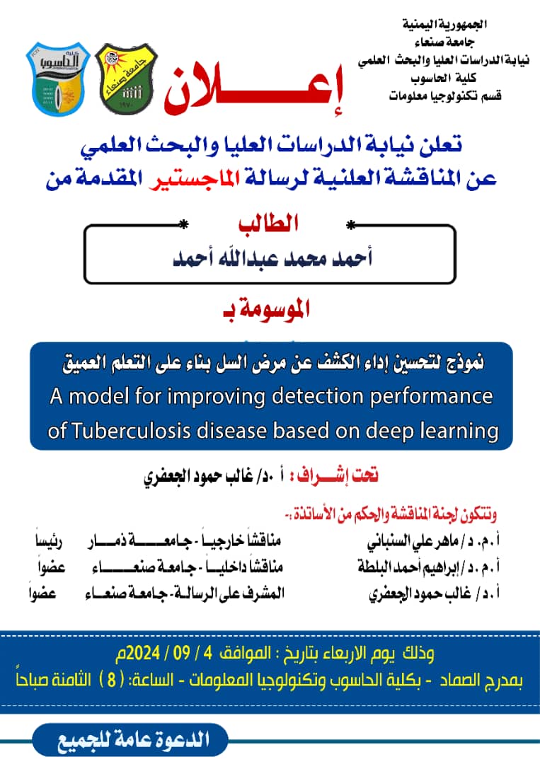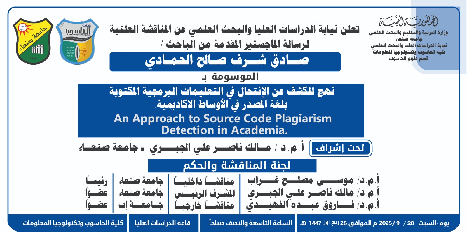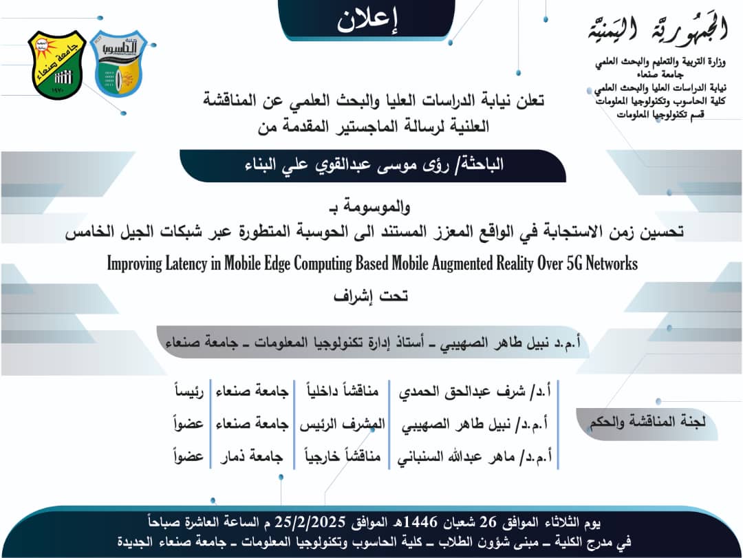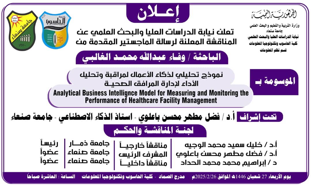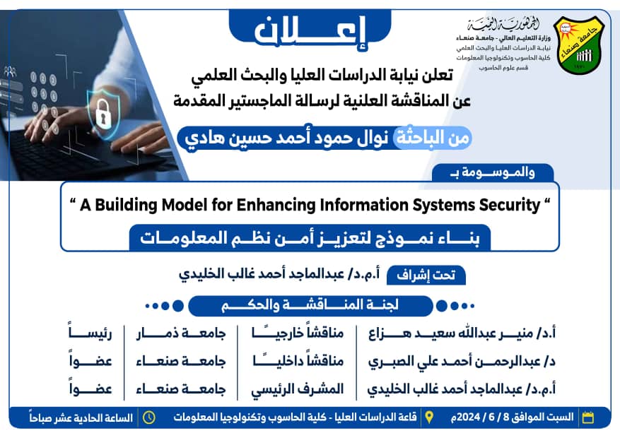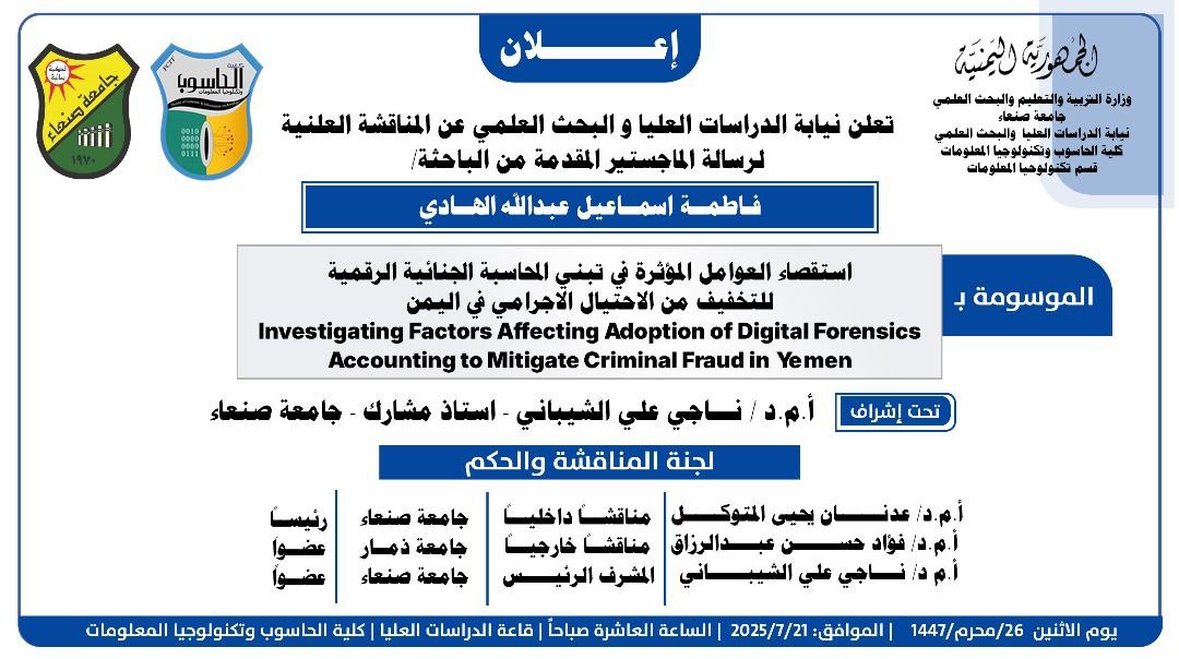 تعلن نيابة الدراسات العليا والبحث العلمي عن المناقشة العلنية لرسالة الماجستير المقدمة من الباحث صادق شرف صالح الحمادي