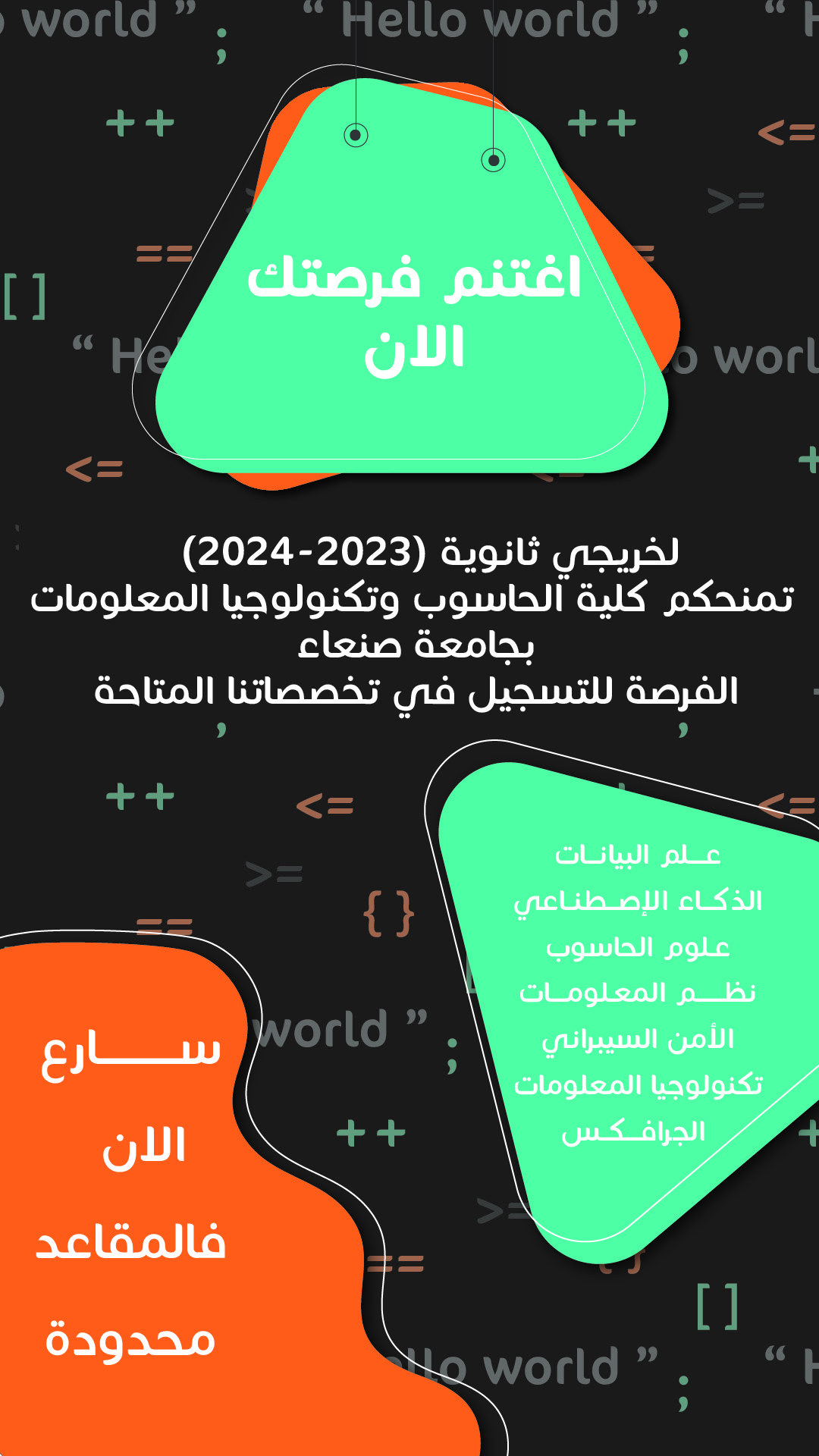 لخريجي الثانوية (2023-2024) تمنحكم كلية الحاسوب وتكنولوجيا المعلومات بجامعة صنعاء الفرصة للتسجيل في تخصصاتنا المتاحة – علم البيانات – …
