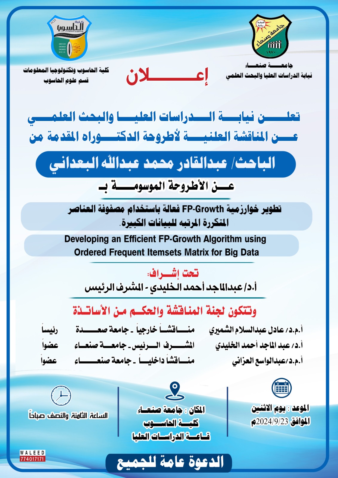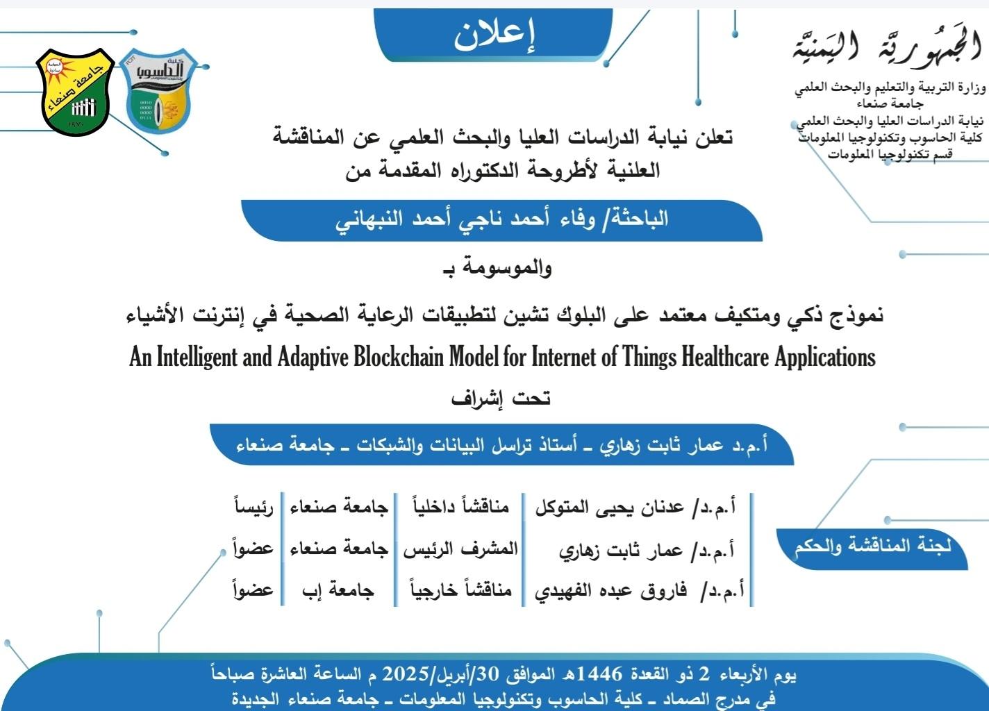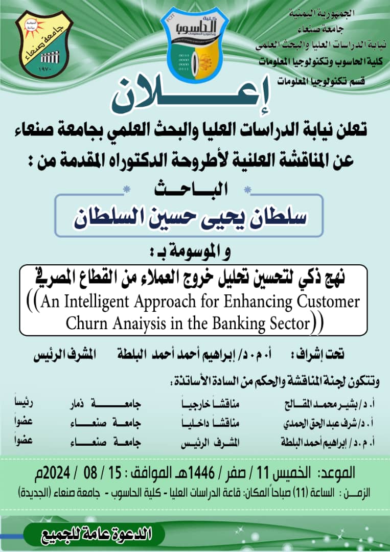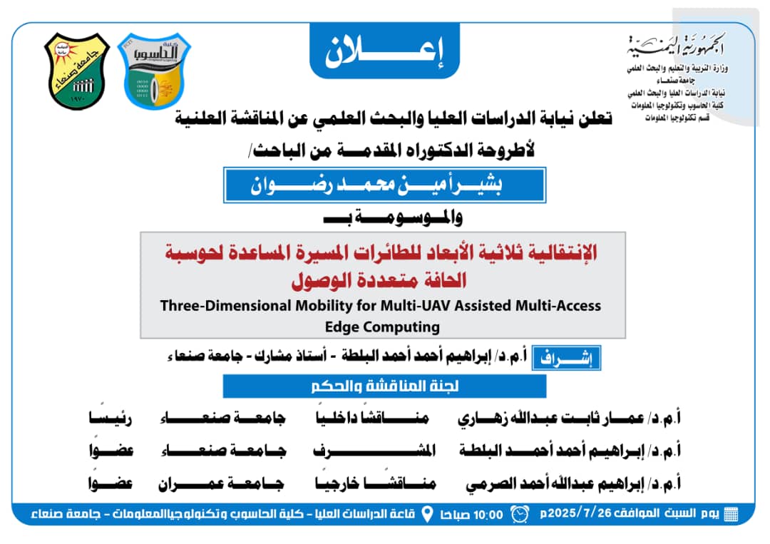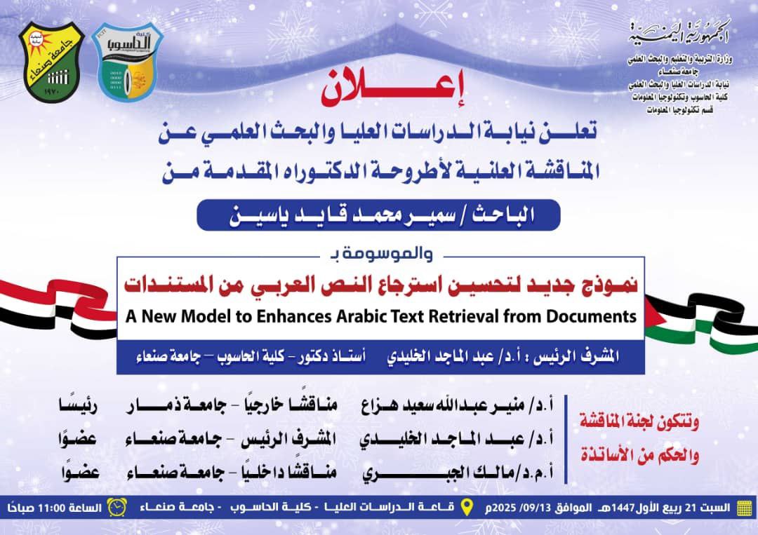 تعلن نيابة الدراسات العليا والبحث العلمي عن المناقشة العلنية لأطروحة الدكتوراه المقدمة من الباحث سمير محمد قائد ياسين