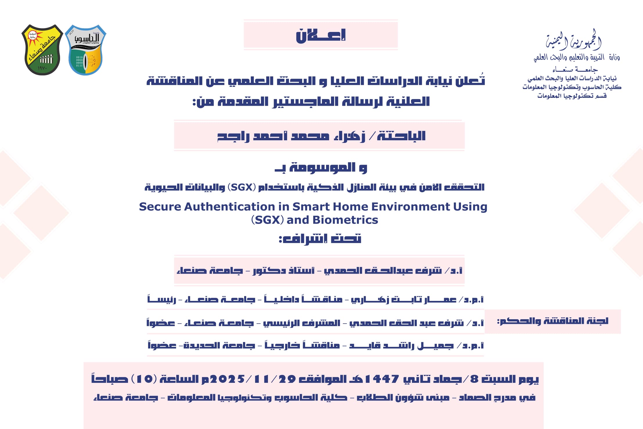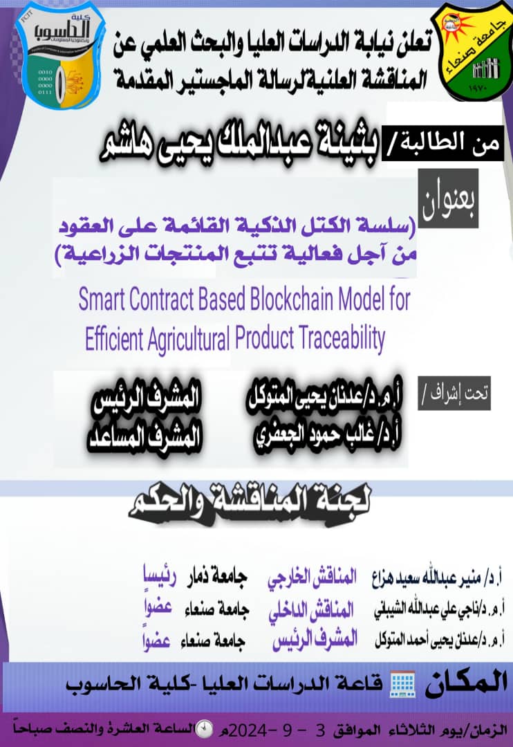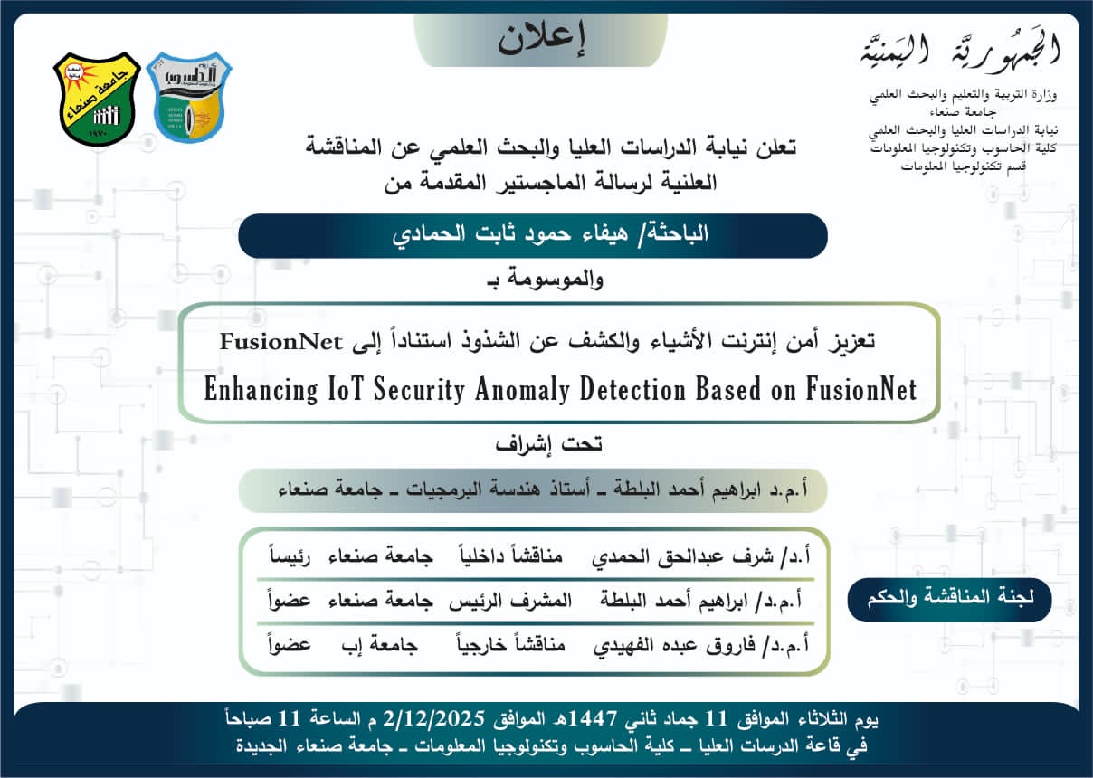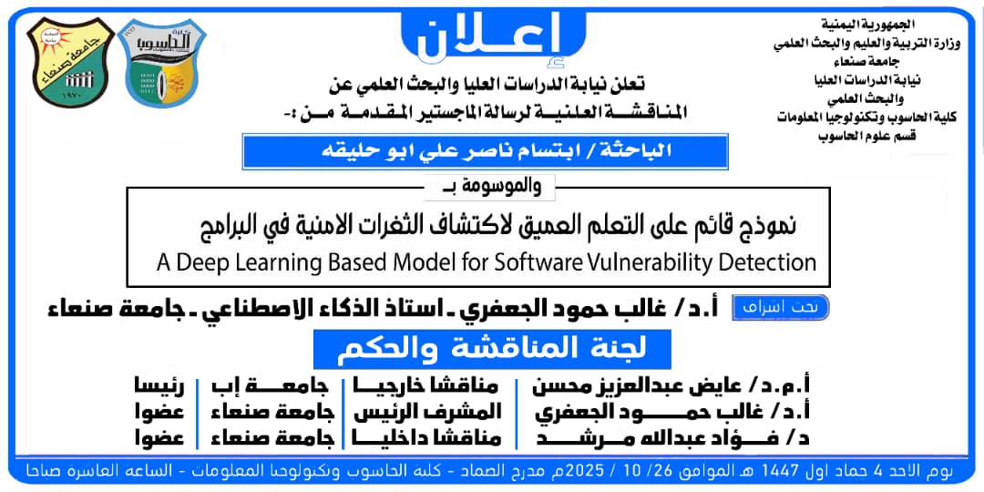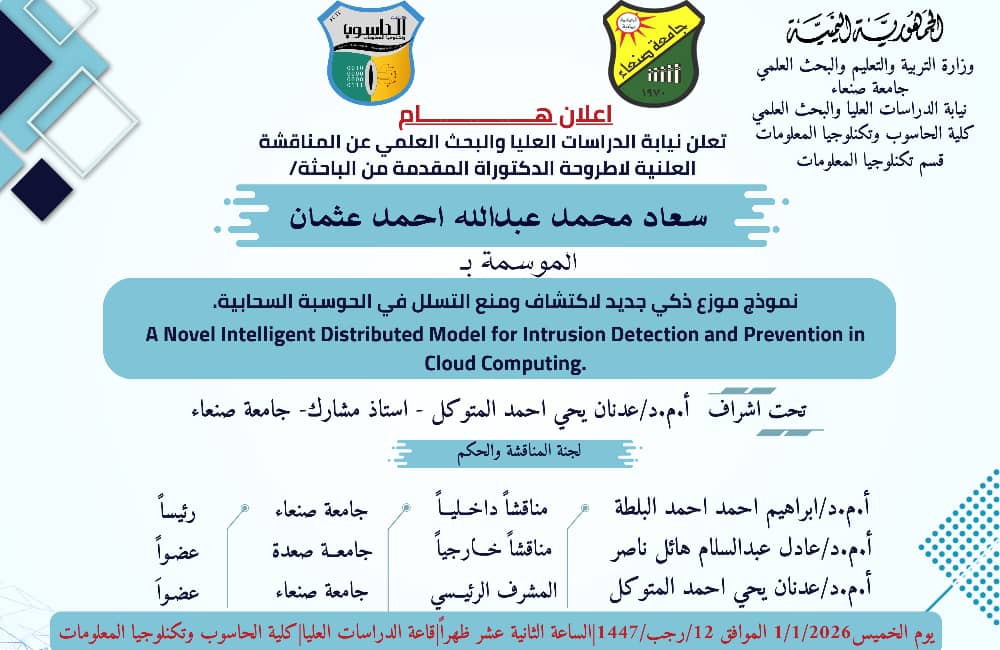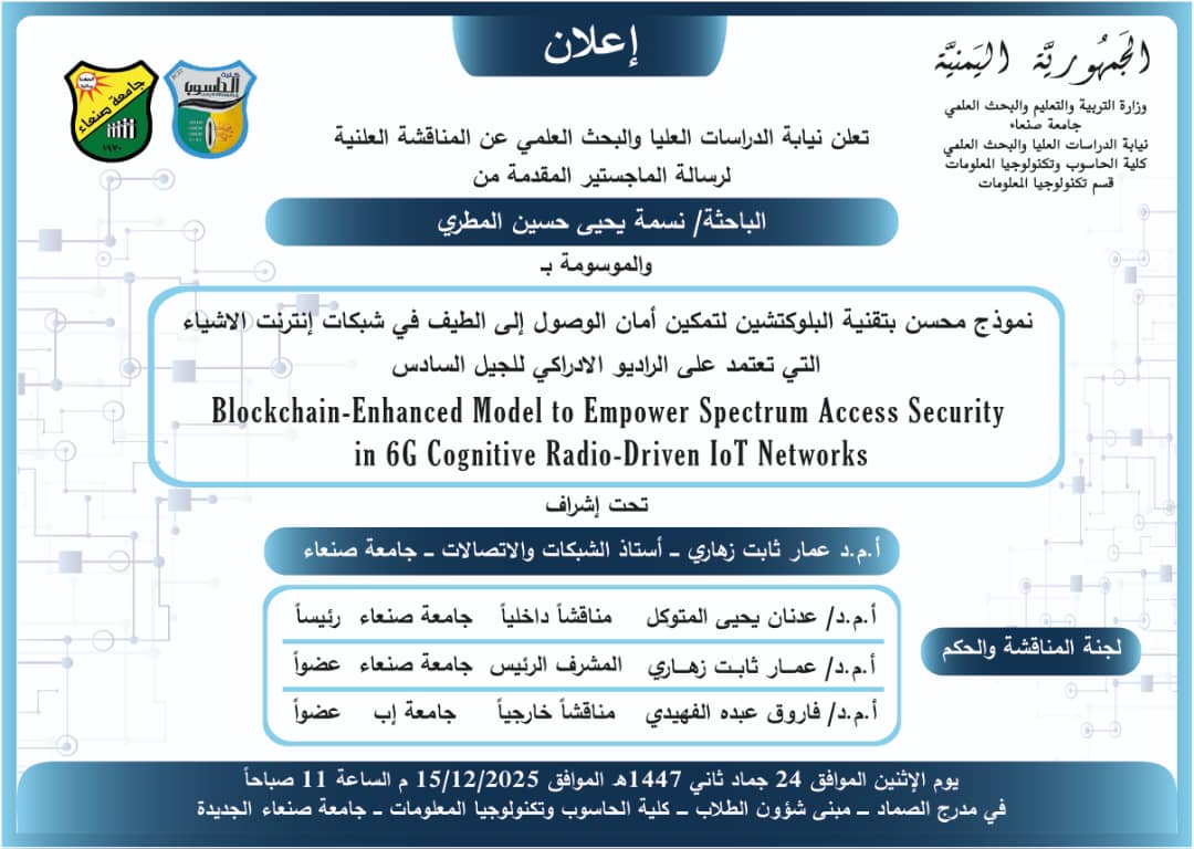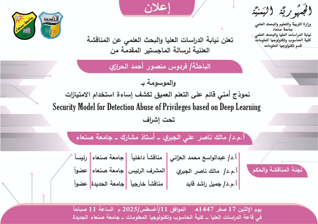 نالت الباحثة/فردوس منصور أحمد الحرازي درجة الماجستير من قسم (علوم الحاسوب) تخصص (أمن سيبراني) كلية (الحاسوب وتكنولوجيا المعلومات) بجامعة صنعاء …
