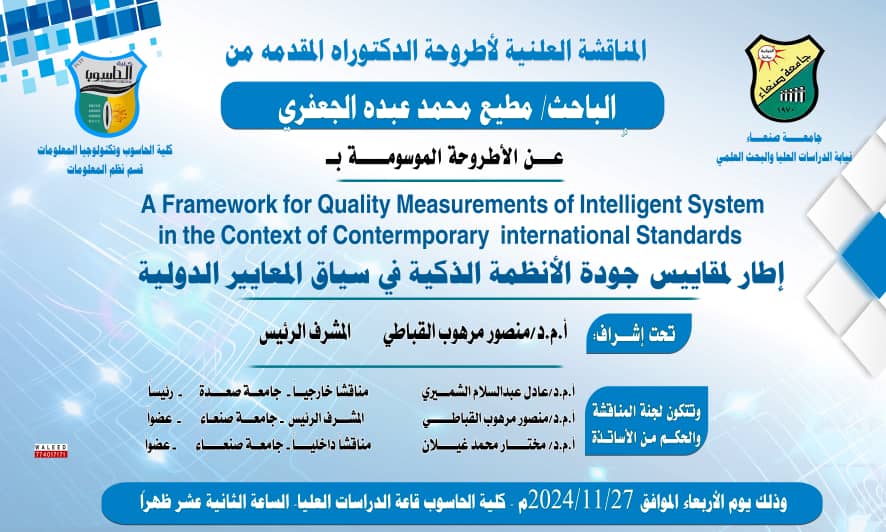 نال الباحث مطيع محمد عبده الجعفري درجة الدكتوراه في قسم نظم المعلومات تخصص (الحوسبة وعلم المعلومات) من كلية الحاسوب …