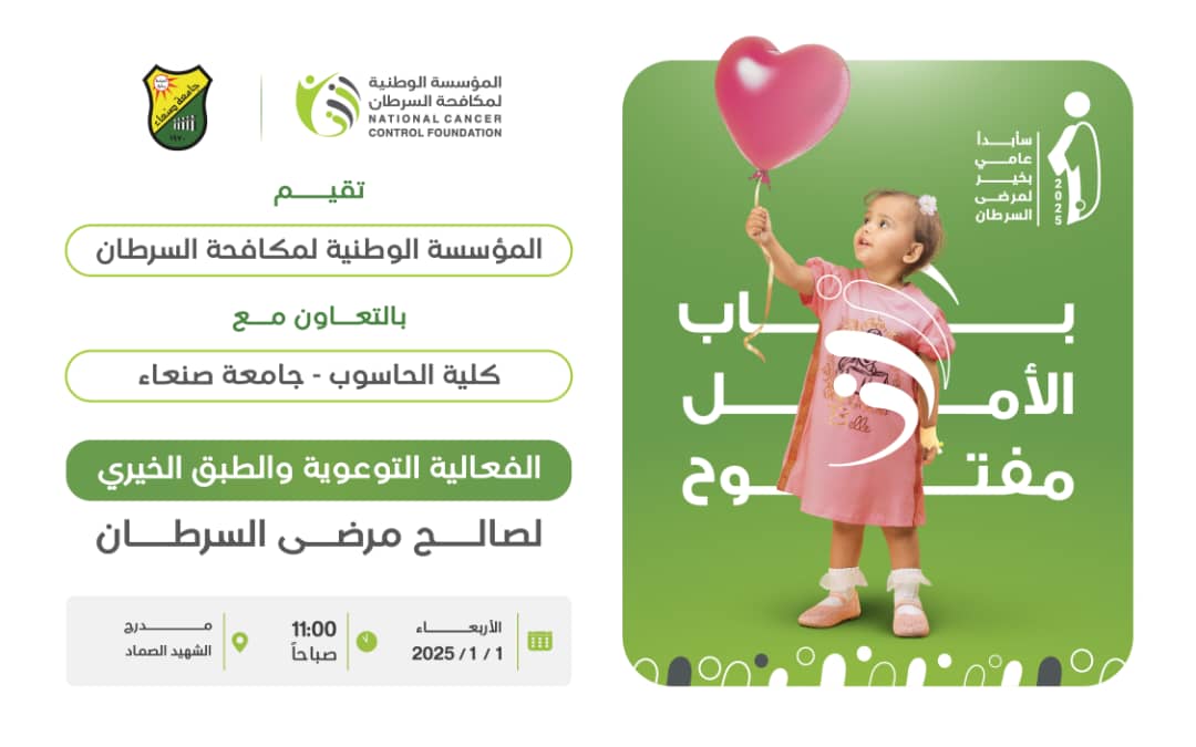تقيم المؤسسة الوطنية لمكافحة السرطان بالتعاون مع كلية الحاسوب وتكنولوجيا المعلومات -جامعة صنعاء الفعالية التوعوية والطبق الخيري لصالح مرضى السرطان …