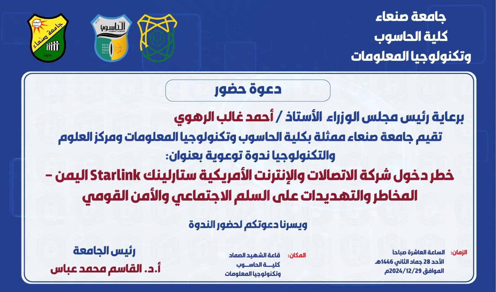 برعاية رئيس مجلس الوزراء الأستاذ / أحمد غالب الرهوي تقيم جامعة صنعاء ممثلة بكلية الحاسوب وتكنولوجيا المعلومات ومركز العلوم والتكنولوجيا …