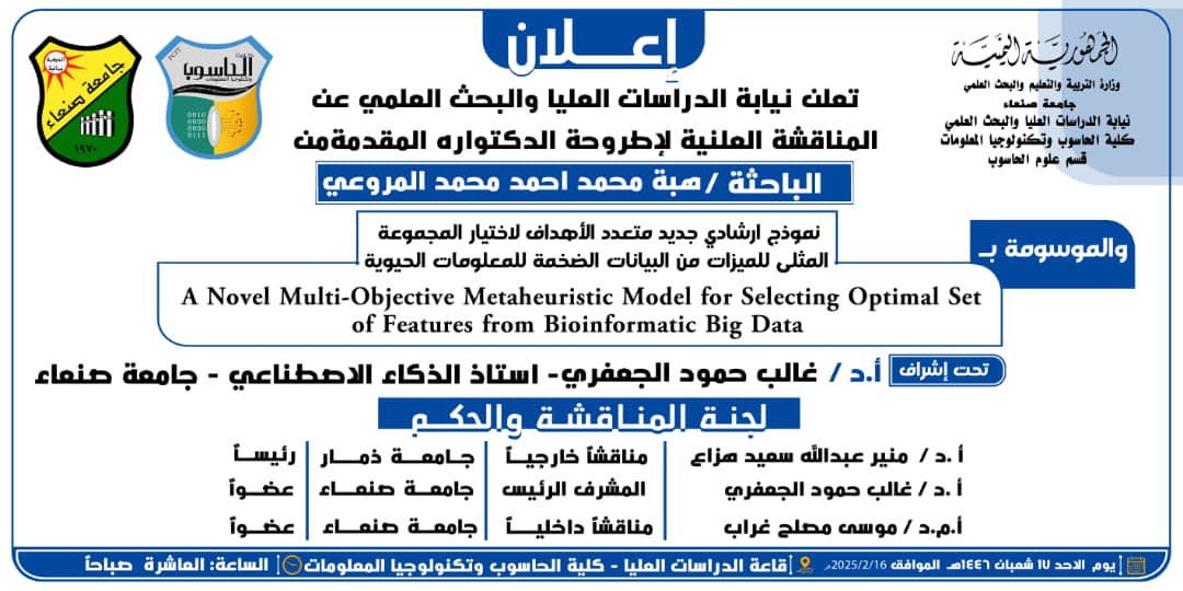 نال الباحث عبدالقادر محمد عبدالله البعداني درجة الدكتوراه في قسم علوم الحاسوب تخصص علوم الحاسوب كلية الحاسوب و تكنولوجيا المعلومات …