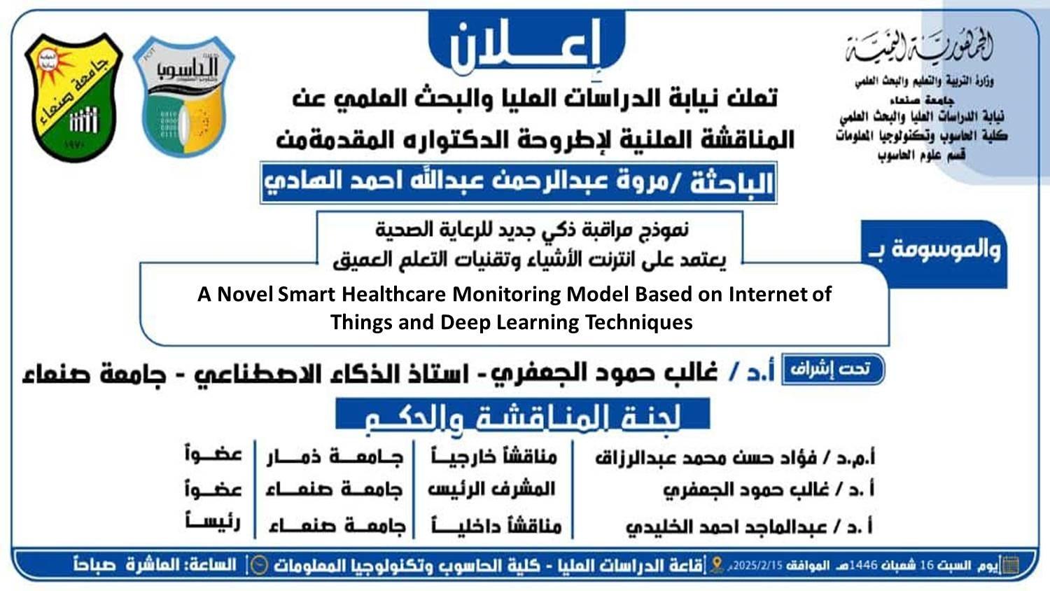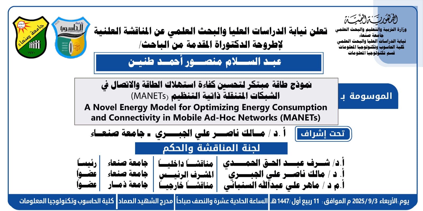 تعلن نيابة الدراسات العليا والبحث العلمي عن المناقشة العلنية لأطروحة الدكتوراه المقدمة من الباحث عبدالسلام منصور أحمد طنين