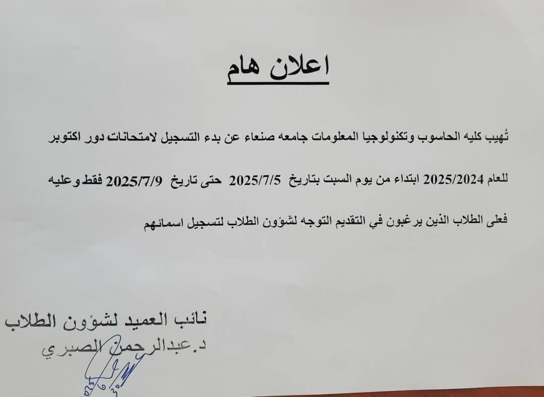 تهيب كلية الحاسوب وتكنولوجيا المعلومات جامعة صنعاء عن بدء التسجيل لامتحانات دور اكتوبر للعام 2024/2025 ابتداء من يوم السبت بتاريخ …