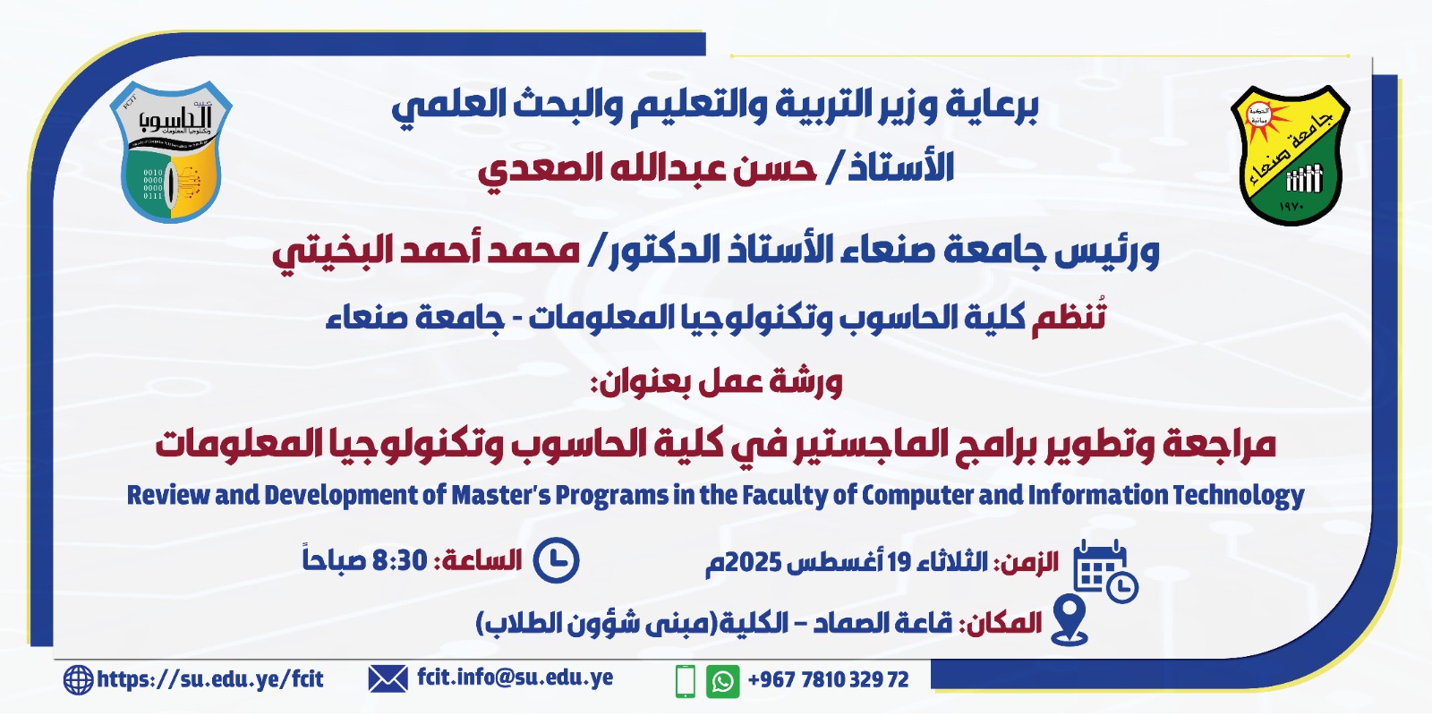 تُعلن كلية الحاسوب وتكنولوجيا المعلومات بجامعة صنعاء عن بدء الفصل الدراسي الثاني لجميع المستويات للعام الجامعي 1447هـ / 2025–2026م، وذلك …