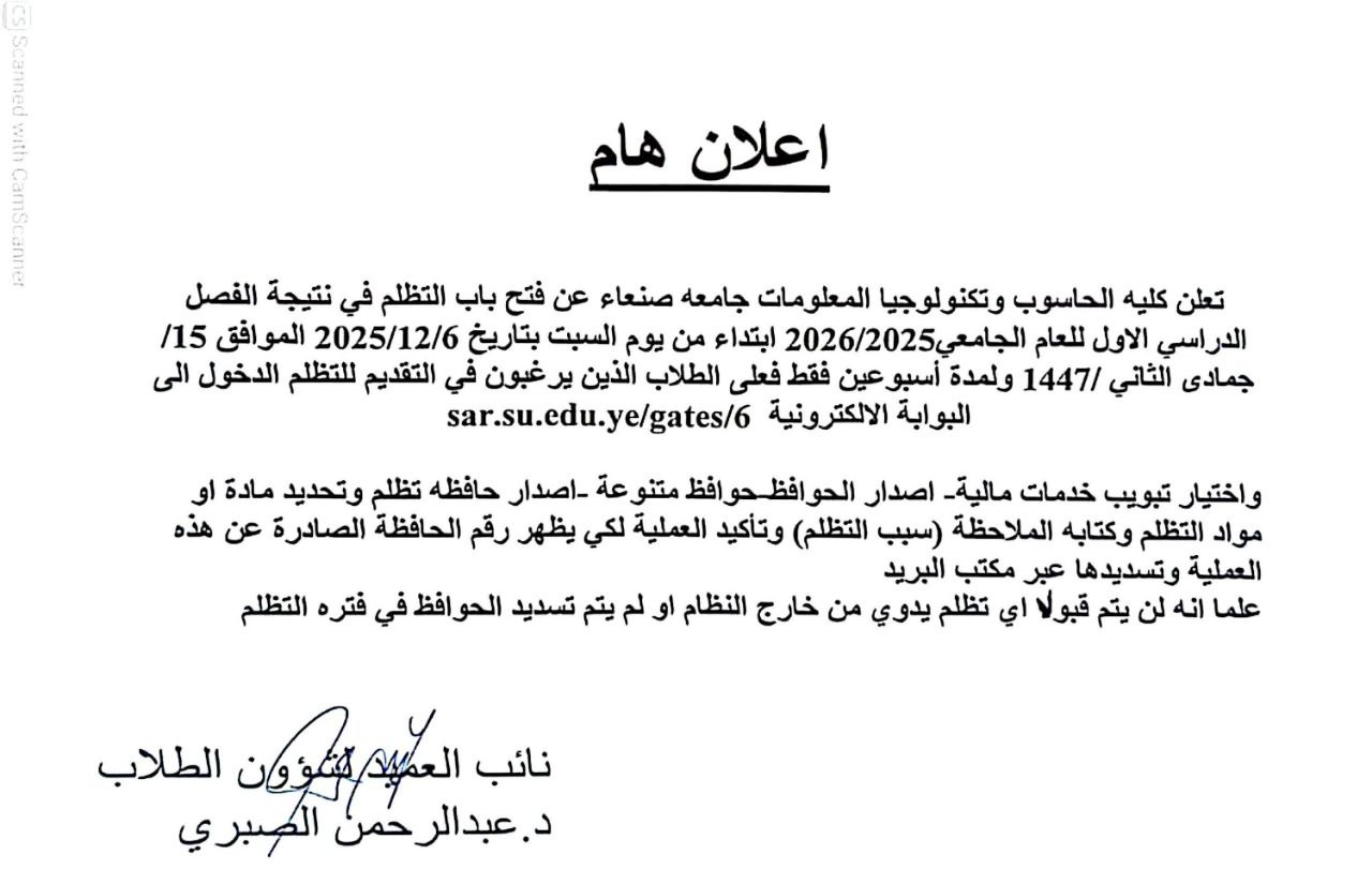 تعلن كلية الحاسوب وتكنولوجيا المعلومات – جامعة صنعاء عن فتح باب التظلّم في نتيجة الفصل الدراسي الأول للعام الجامعي 2025/2026، …