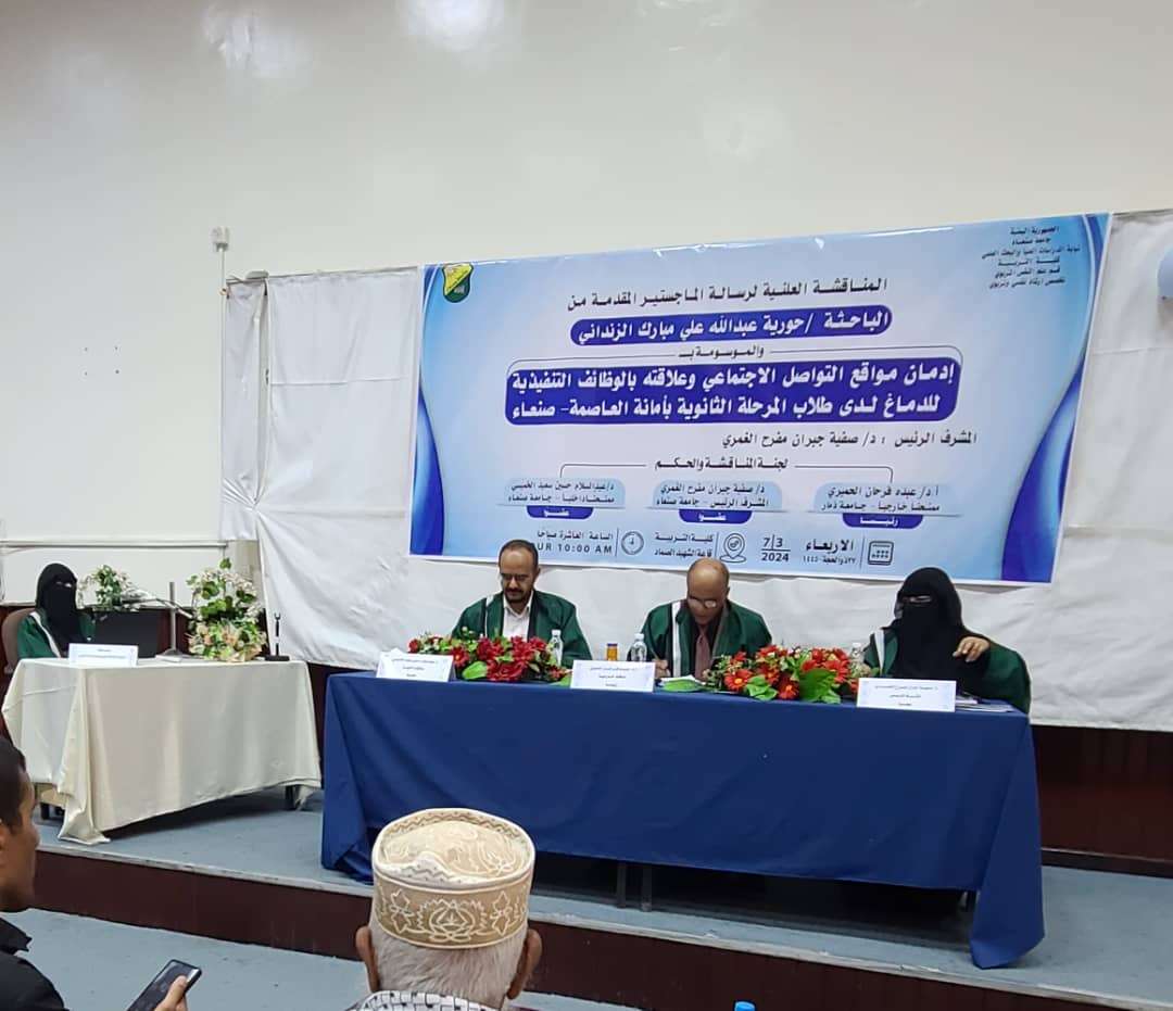 جامعة صنعاء كلية التربية – صنعاء مناقشة علمية لنيل درجة الماجستير 26 ذي الحجة 1445 1 يوليو 2024 مناقشة رسالة الماجستير-تخصص علم نفس تربوي- المقدمة من الطالبة حورية عبدالله الزنداني بعنوان (ادمان مواقع التواصل الاجتماعي وعلاقته بالوظائف التنفيذية للدماغ لدى …