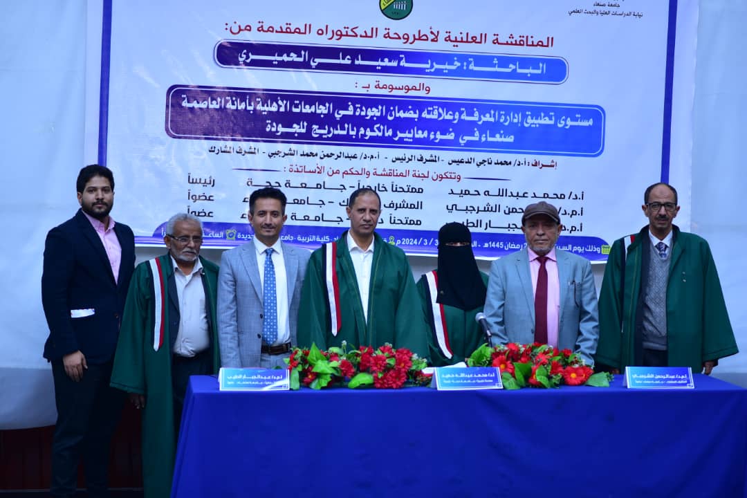 في رحاب جامعة صنعاء وفي صرح كلية التربية منحت الباحثة خيرية سعيد علي الحميري درجة الدكتوراه في الإدارة والتخطيط التربوي بعد مناقشة مستفيضة بتقدير امتياز مع التوصية بطباعة الأطروحة وتداولها بين الجامعات وقد تكونت لجنة المناقشة والحكم من الأستاذ الدكتور …