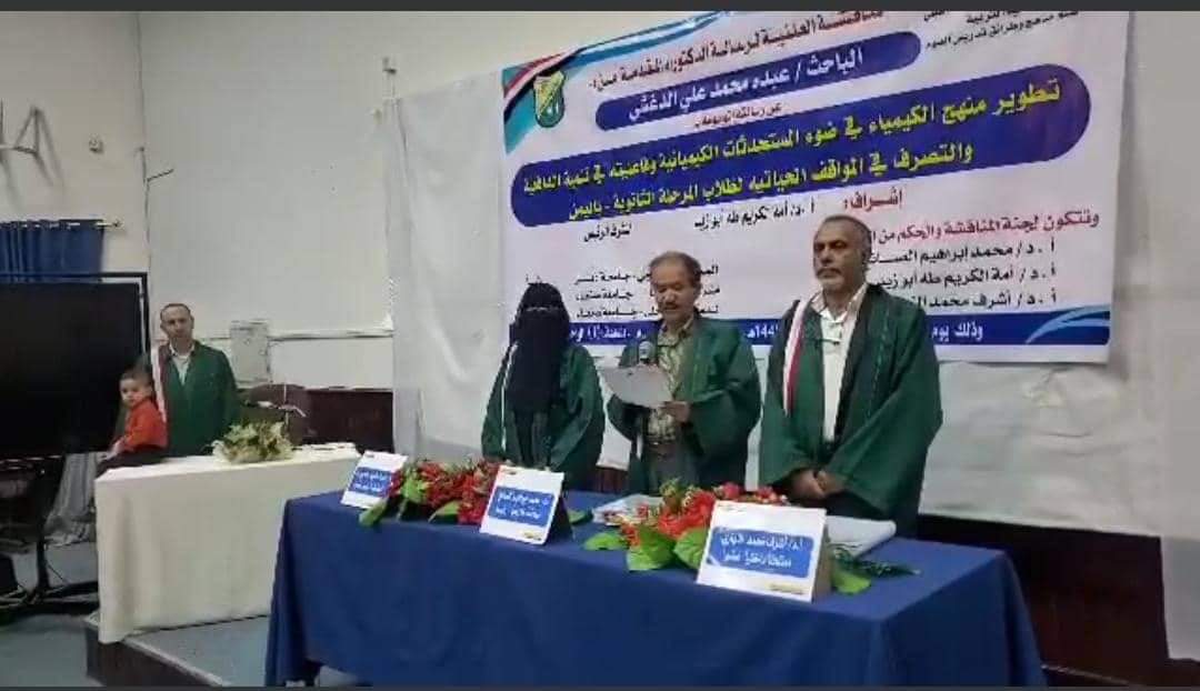 كلية التربية صنعاء الخميس 18 رمضان 1445ه. الموافق 28 مارس 2024م، مناقشة رسالة الدكتوراه للباحث عبده الدغشي بعنوان (تطوير منهج الكيمياء في ضوء المستحدثات الكيميائية وفاعليته في تنمية الدافعية للتعلم والتصرف في المواقف الحياتية لطلاب المرحلة الثانوية باليمن) وقد تشكلت …