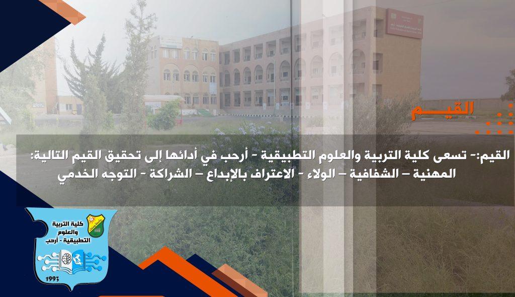 القيم:- تسعى كلية التربية والعلوم التطبيقية – ارحب في أدائها إلى تحقيق القيم التالية:
