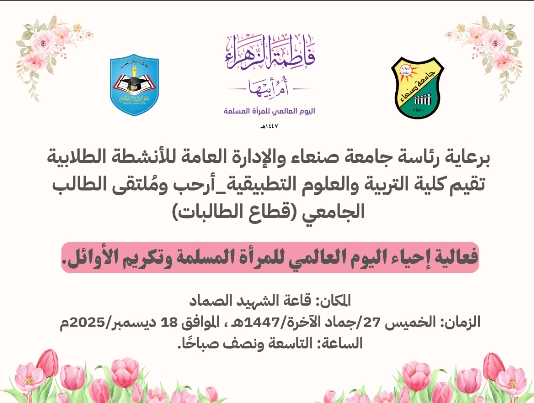 فعالية إحياء اليوم العالمي للمرأة المسلمة جامعة صنعاء كلية التربية والعلوم التطبيقية – أرحب🎓 إعلام الكلية 🔰 📅 الخميس 17 جمادى الآخرة 1447هـ 📆 الموافق 18 ديسمبر 2025م برعاية رئاسة جامعة صنعاء والإدارة العامة للأنشطة الطلابية، أقامت كلية التربية …