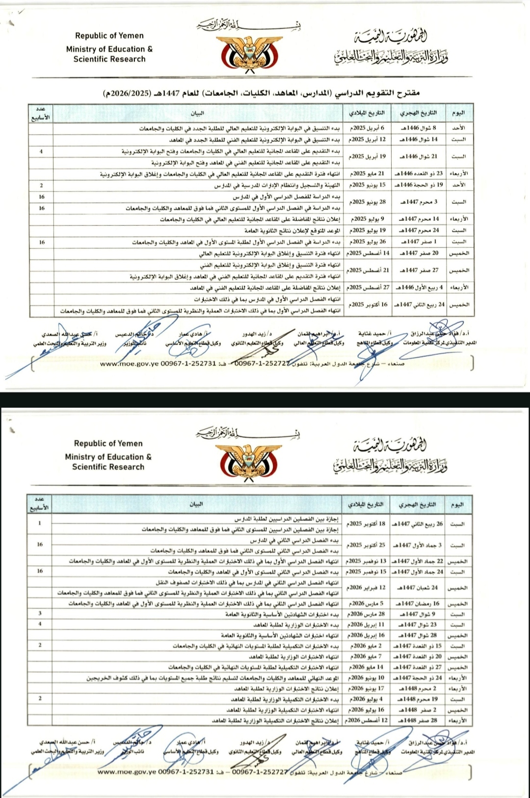 التقويم الدراسي للعام الجامعي 1447هـ الموافق 2026/2025م بحسب وزارة التربية والتعليم والبحث العلمي