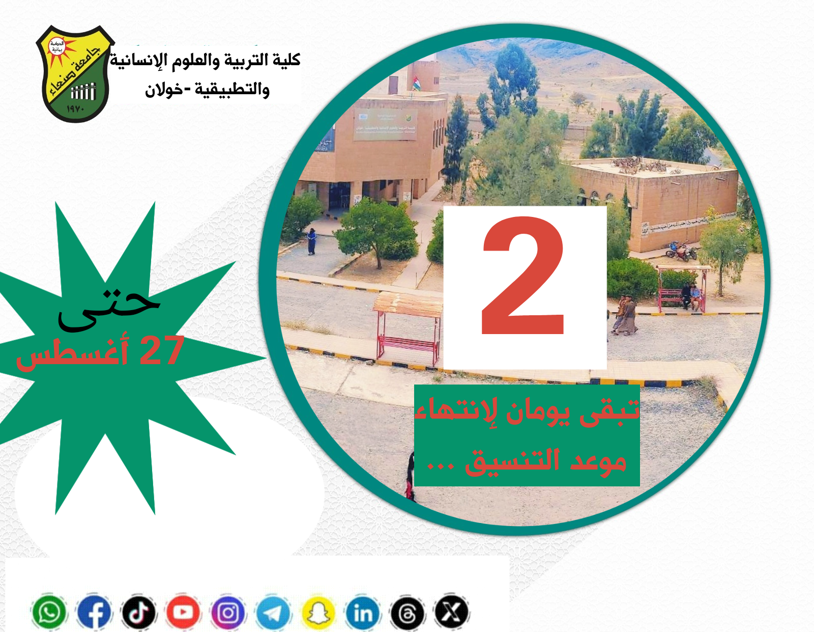 يومان فقط تفصلنا عن انتهاء فترة التنسيق والقبول في كلية التربية والعلوم الإنسانية والتطبيقية -خولان جامعة صنعاء، وذلك حتى تاريخ 27 أغسطس 2025م، في جميع أقسام الكلية بنظامها العام والموازي والنفقة الخاصة للعام الجامعي 1447هـ/ 2025/2026م.