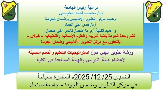 أُقيمت صباح اليوم الخميس 25 ديسمبر 2025م ورشة تطوير مهني بعنوان «استراتيجيات التعليم والتعلّم الحديثة»، استهدفت أعضاء هيئة التدريس والهيئة المساعدة بكلية التربية والعلوم الإنسانية والتطبيقية – خولان، وذلك في مركز التطوير الأكاديمي وضمان الجودة بجامعة صنعاء، بتنظيم وحدة الجودة بالكلية، وبالتعاون مع مركز التطوير الأكاديمي وضمان الجودة، وبرعاية رئيس الجامعة الأستاذ الدكتور محمد أحمد البخيتي.