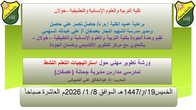 نظمت وحدة الجودة بكلية التربية والعلوم الإنسانية والتطبيقية – خولان، بالتعاون مع مركز التطوير الأكاديمي وضمان الجودة، صباح يوم الخميس الموافق 8 يناير 2026م، الموافق 19 رجب 1447هـ، ورشة تدريبية بعنوان (استراتيجيات التعلّم النشط) لمعلّمي مدارس مديرية جحانة .. عصفان برعاية عميد الكلية الأستاذ الدكتور/ حاصل ناصر علي حاصل وبحضور مدير مدرسة الشهيد النجار بعصفان الأستاذ/ علي عبدالله السهمي.